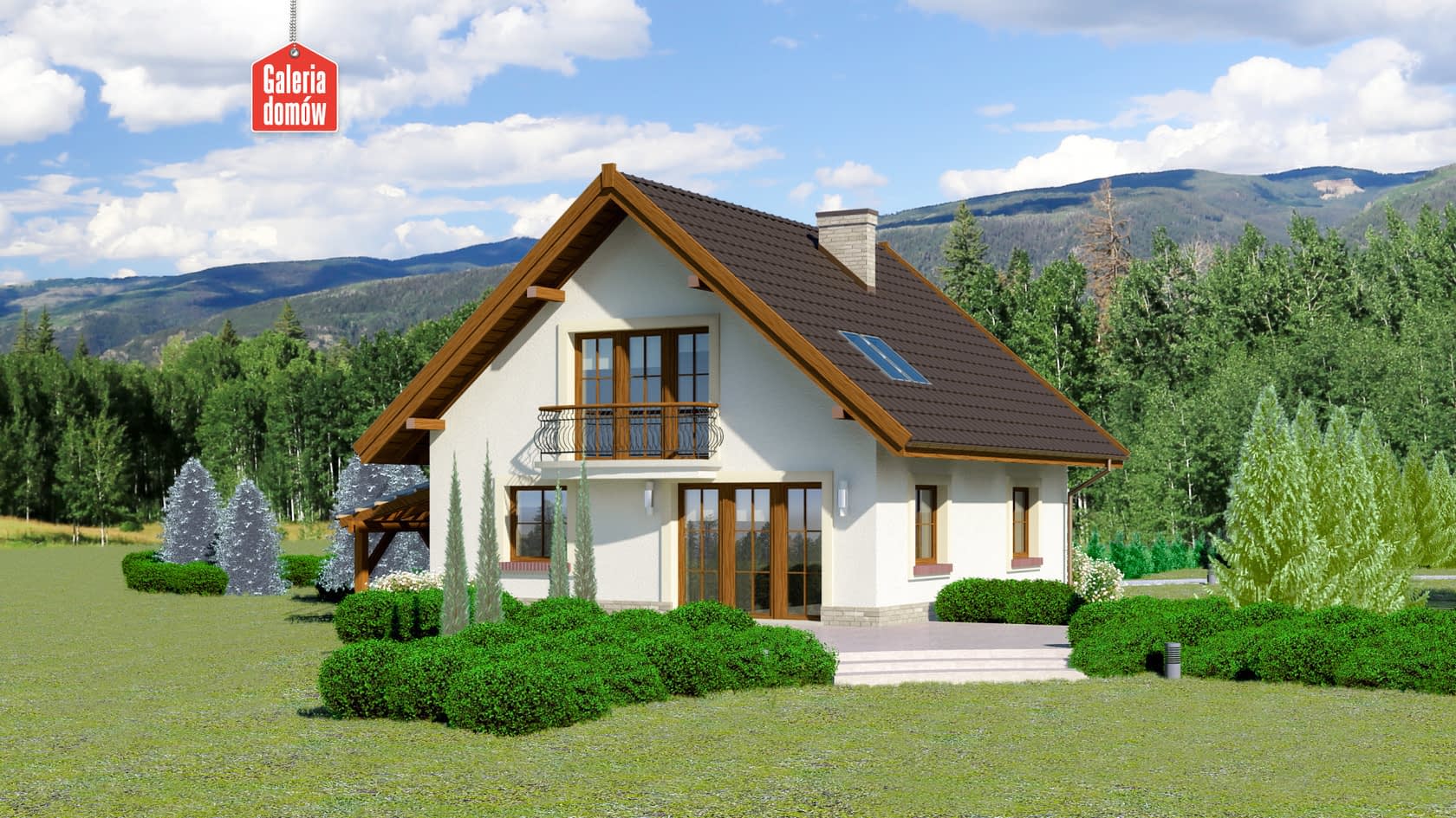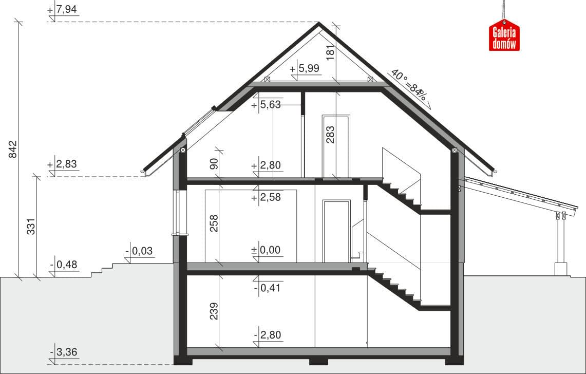 Dach: kąt nachylenia 40°, pokrycie - dachówka ceramiczna lub betonowa.