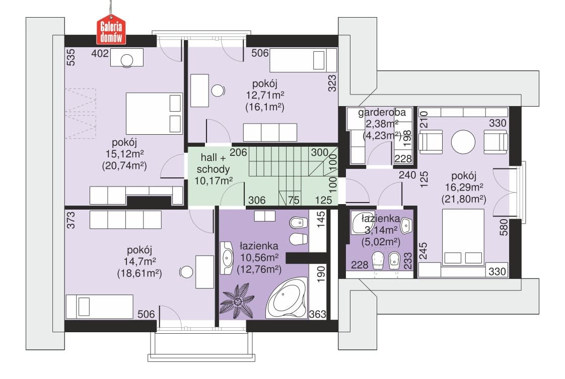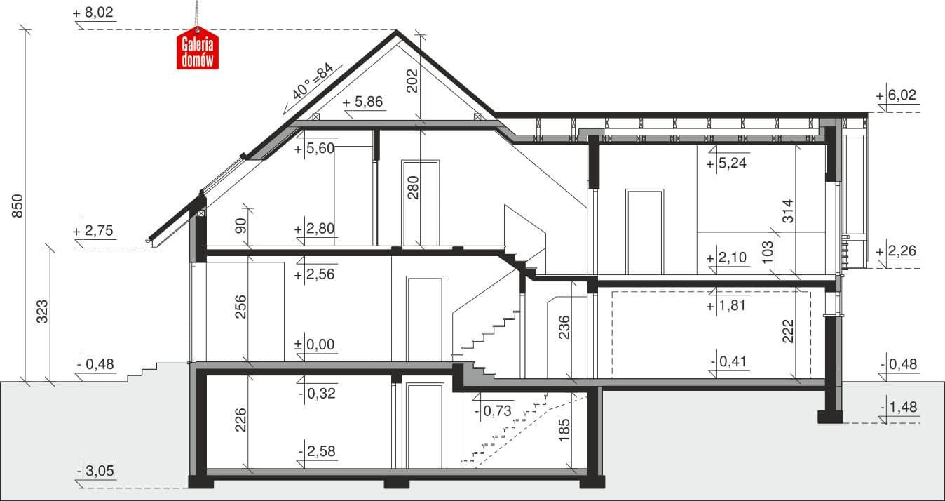 Dach: kąt nachylenia 40°, pokrycie - dachówka ceramiczna lub betonowa.