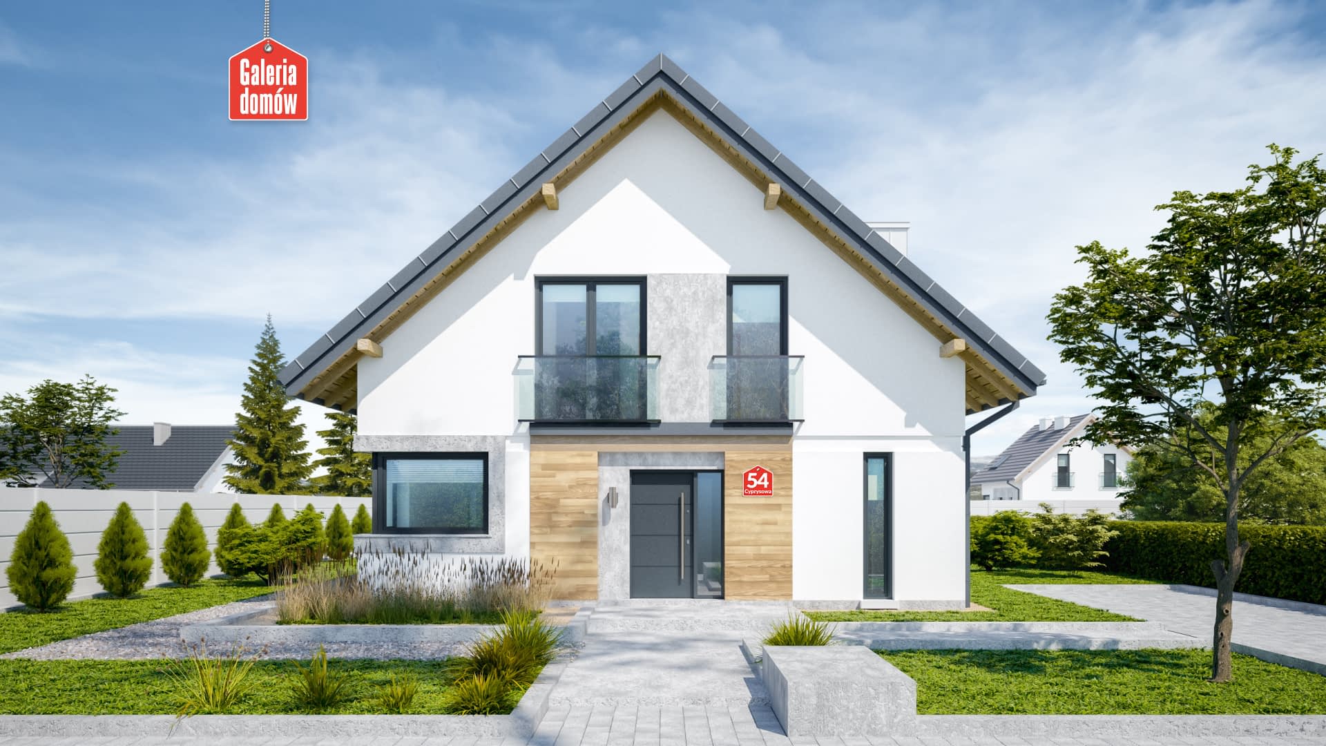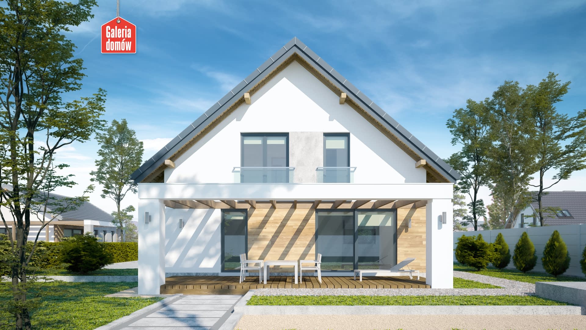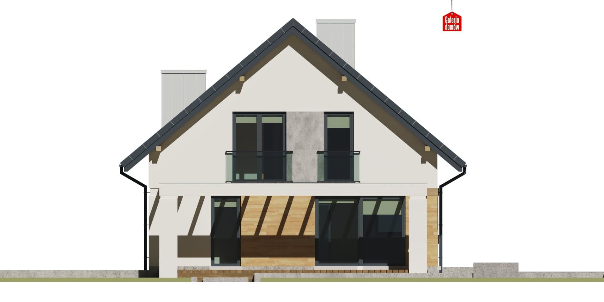 Energooszczędny dom z poddaszem, o zwartej bryle przykrytej dwuspadowym dachem, architekturą nawiązujący do najlepszych trendów dzisiejszej sztuki projektowej. Szklane balkony, metaliczna stolarka aluminiowa, oryginalne oświetlenie i biała elewacja podkreślają oryginalny, współczesny charakter domu. Komfort użytkowania zapewnia funkcjonalny podział wnętrza na strefę dzienną i nocną. Na parterze znajduje się słoneczny salon, z którego przesuwnymi drzwiami można wyjść na, otoczony nowoczesną pergolą, taras. Poz tym parter oferuje dużą kuchnię, łazienkę i dodatkowy pokój. Na poddaszu zaprojektowano trzy przytulne i jasne sypialnie oraz drugą łazienkę.Ekonomiczny i ergonomiczny dom będący ozdobą każdej działki, utrzymany w nowoczesnym stylu.Konstrukcja