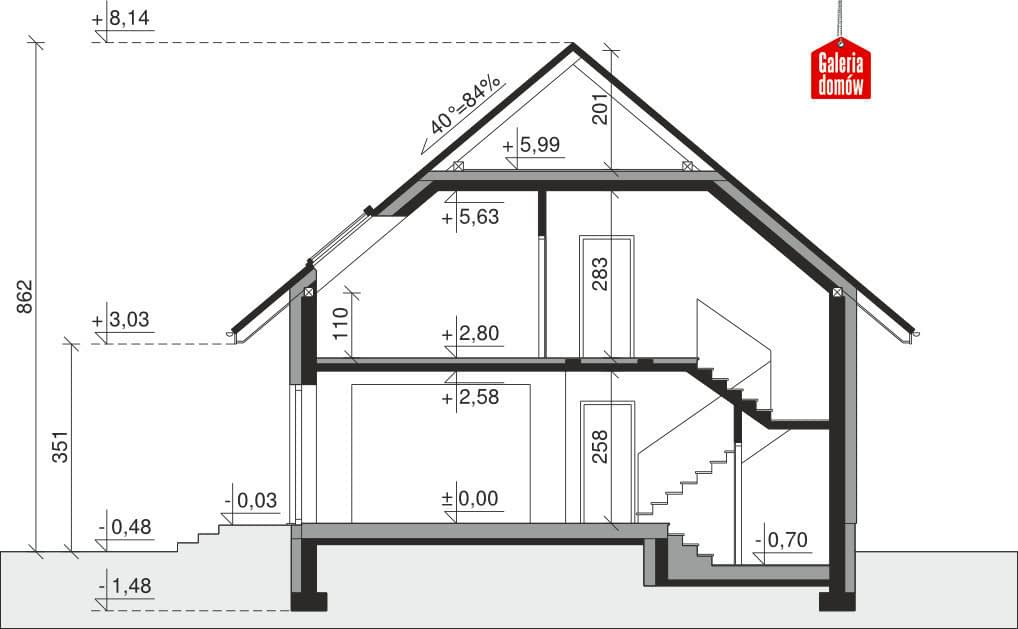 Dach: kąt nachylenia 40°, pokrycie - dachówka ceramiczna lub betonowa.