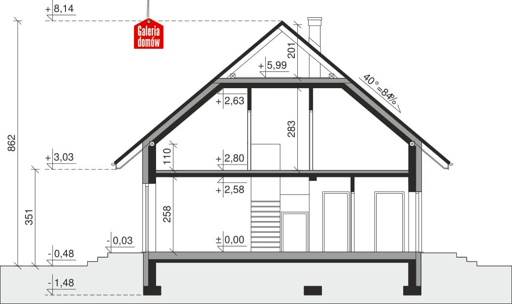 Dach: kąt nachylenia 40°, pokrycie - dachówka ceramiczna lub betonowa.