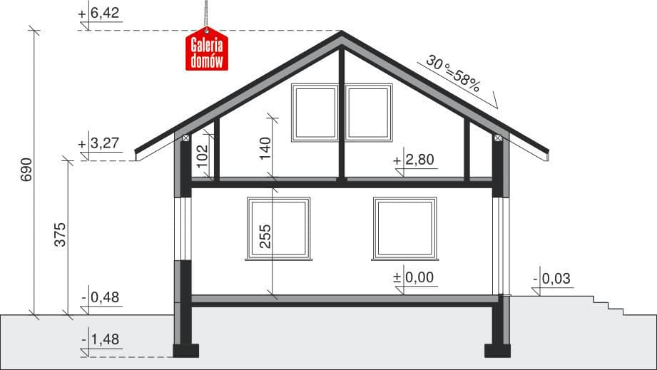 Dach: kąt nachylenia 30°, pokrycie - dachówka ceramiczna lub betonowa.