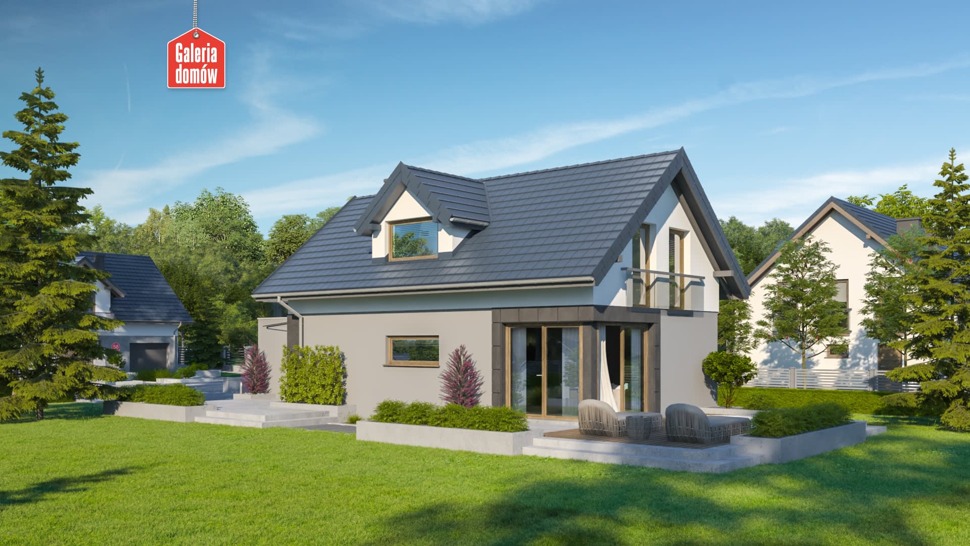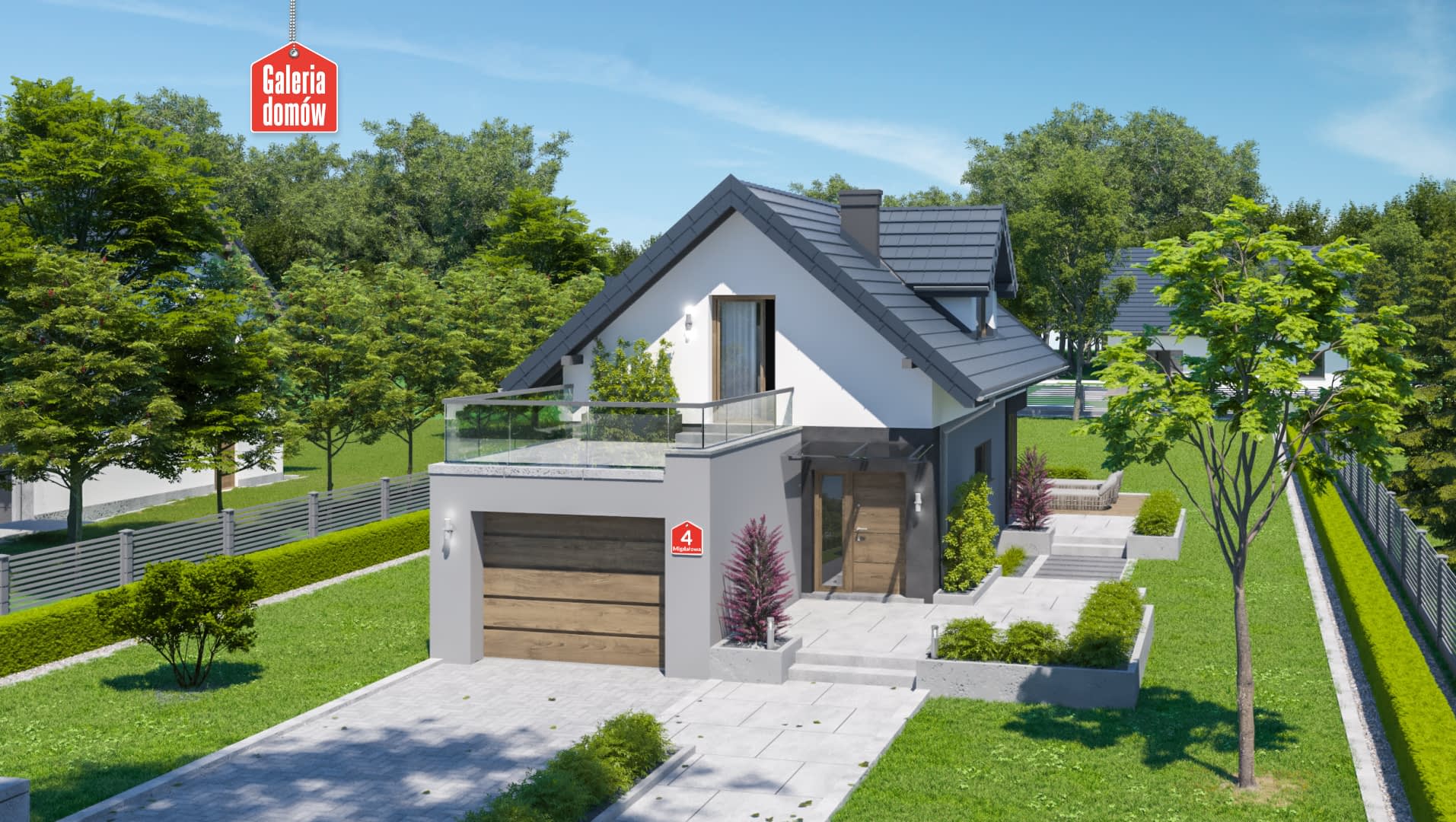 Dom przy Migdałowej 4 to budynek jednorodzinny z dachem dwuspadowym przygotowany z myślą o wąskich działkach. Prosta konstrukcja dachu oraz forma budynku sprawiają, iż jest to dom oszczędny w budowie i nie sprawia trudności w trakcie realizacji. Wnętrze dzieli się na strefę dzienną, na parterze i nocną, na poddaszu. Przestronny salon posiada szerokie przeszklenia, co sprawia iż przyjemnie otwiera się na zieloną strefę ogrodu. Znalazło się w nim miejsce na kominek, narożną sofę oraz stół jadalniany. Kuchnia również posiada duże okno, przez co pracuje się w niej przyjemnie. Na parterze zaprojektowano również niewielką łazienkę, pralnię i spiżarnię. Poddasze mieści 3 pokoje, główną łazienkę oraz garderobę. Każdy pokój ma dostęp do balkonów. Sypialnia małżeńska wychodzi na okazały taras. Nowoczesna estetyka, energooszczędne rozwiązania i przemyślany układ wnętrza sprawiają, iż dom jest ciekawą propozycją, szczególnie dla inwestorów posiadających wąskie działki.Konstrukcja