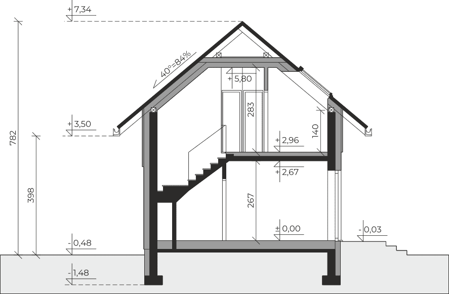 Dach: kąt nachylenia 40°, pokrycie - dachówka ceramiczna lub betonowa.