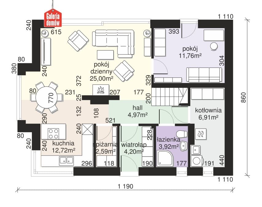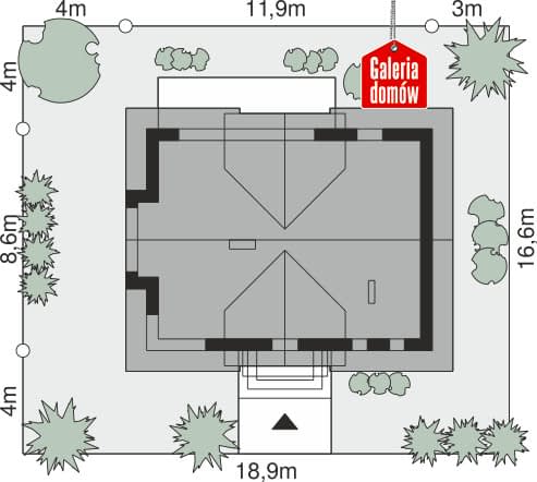 Dach: kąt nachylenia 40°, pokrycie - dachówka ceramiczna lub betonowa.