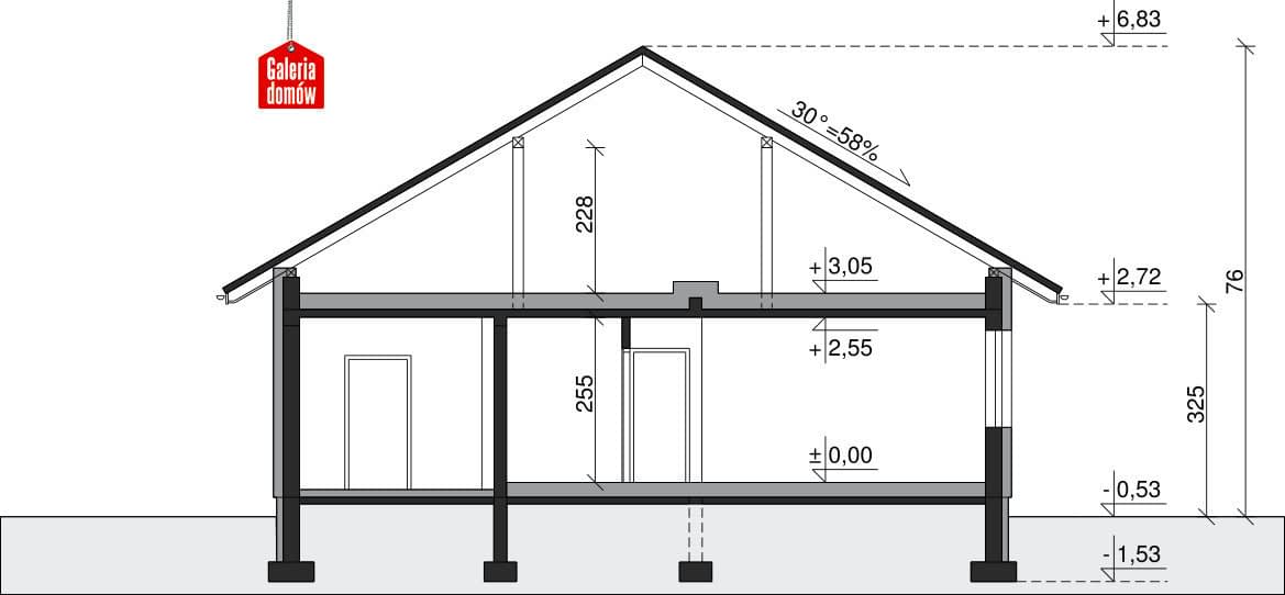 Dach: kąt nachylenia 30°, pokrycie - dachówka ceramiczna lub betonowa.