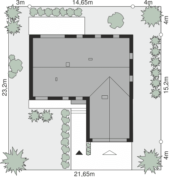 - Minimalne wymiary działki23.2 x 21.65m