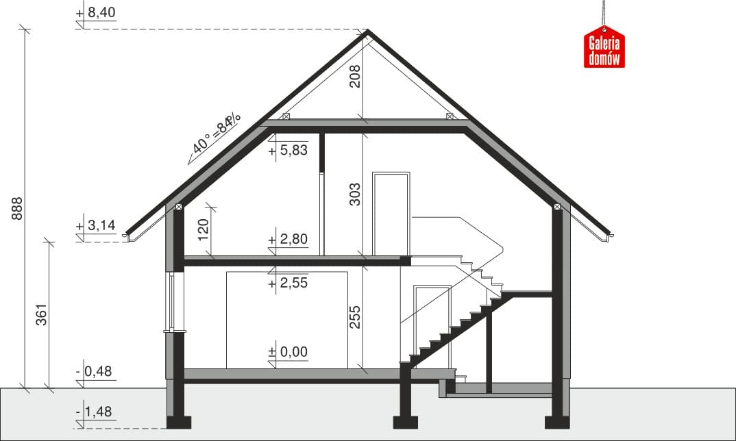 Dach: kąt nachylenia 40°, pokrycie - dachówka ceramiczna lub betonowa.