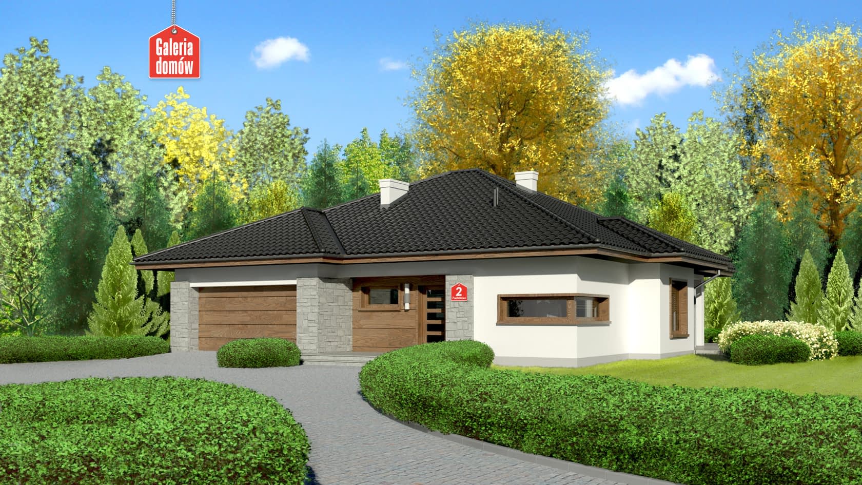 Dom przy Pastelowej 2 to nowoczesny dom parterowy z dwustanowiskowym garażem. Prezentuje inteligentne połączenie formy i komfortu mieszkania. Nieskomplikowana bryła nakryta czterospadowym dachem oraz jasne i proste elewacje sprawiają, że budynek dobrze wtapia się w otoczenie. Funkcjonalnie zaprojektowane wnętrze zapewnia wygodę czteroosobowej rodzinie. Po prawej stronie otwarta kuchnia, jadalnia i duży salon z wyjściem do ogrodu tworzą część dzienną. Po lewej stronie, w wydzielonej części prywatnej, znajdują się trzy sypialnie, łazienka i garderoba.Konstrukcja