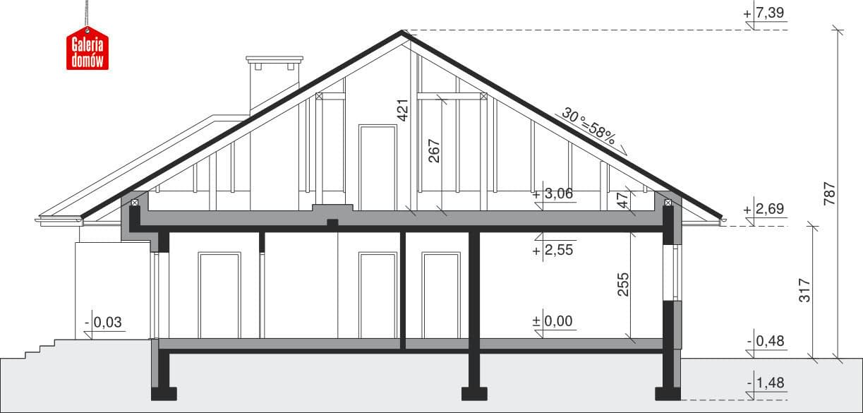 Dach: kąt nachylenia 30°, pokrycie - dachówka ceramiczna lub betonowa.