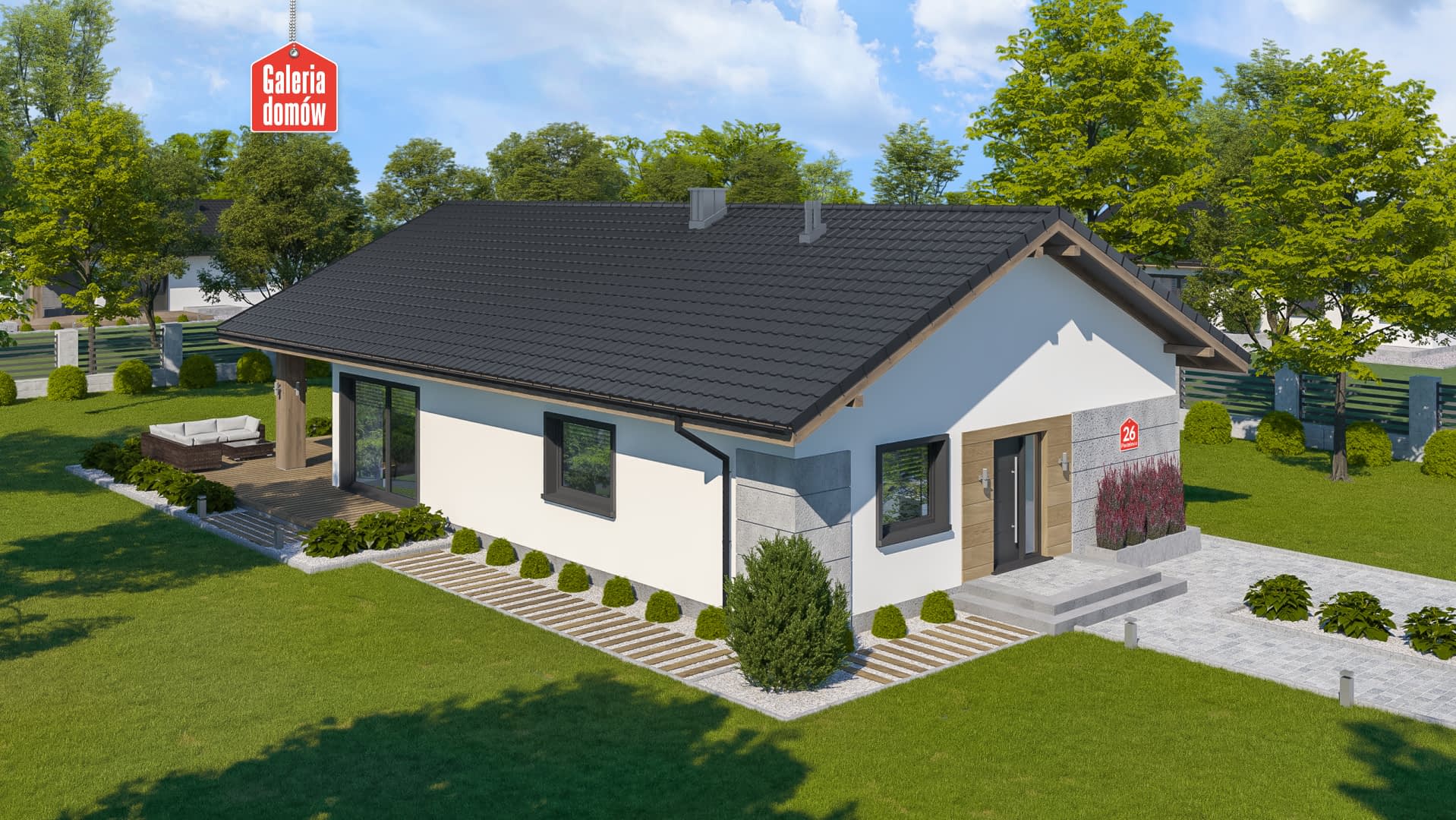 Dom przy Pastelowej 26 to dom jednorodzinny, parterowy, o powierzchni użytkowej 108,67 m². Projekt domu bez garażu, o prostej konstrukcji i zwartej bryle. Dom doskonale nadaje się na wąskie działki o szerokości nieprzekraczającej 18 m. Wnętrze zawiera otwarty pokój dzienny z kuchnią i jadalnią, 3 pokoje dodatkowe, 2 łazienki oraz kotłownię. Wykonany w nowoczesnym stylu, posiada duże przeszklenia oraz zadaszony taras. Dom przy Pastelowej 26 to dom energooszczędny, w którym przewidziano łatwe w obsłudze ogrzewanie gazowe. Budynek został zaprojektowany zgodnie z warunkami technicznymi WT 2021, w technologii tradycyjnej, murowanej. Pastelowa 26 jest budynkiem tanim w budowie. To doskonały wybór dla 4-5 osobowej rodziny.Konstrukcja