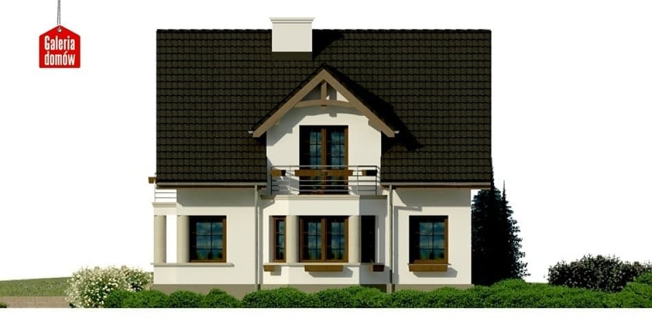 Niewielki dom z użytkowym poddaszem, przyjazny kilkuosobowej rodzinie. Jest tradycyjny i ekonomiczny, a przy tym po prostu ładny: biała elewacja w połączeniu z ciemnym dachem zawsze wygląda świeżo. Wejście domu zostało zadaszone balkonem wspartym na kolumnach. Drugi balkon znajduje się nad przeszklonym wykuszem. Stylowy charakter podkreślają szprosy w oknach. Salon połączony z jadalnią, kuchnią i częścią holu tworzy przestronną część dzienną domu. Dodatkowy pokój na parterze może pełnić funkcję gabinetu lub pracowni. Poddasze zaprojektowano tak, aby każdy z domowników miał swoją prywatną przestrzeń. Znajdują się tu trzy sypialnie i łazienka.Konstrukcja