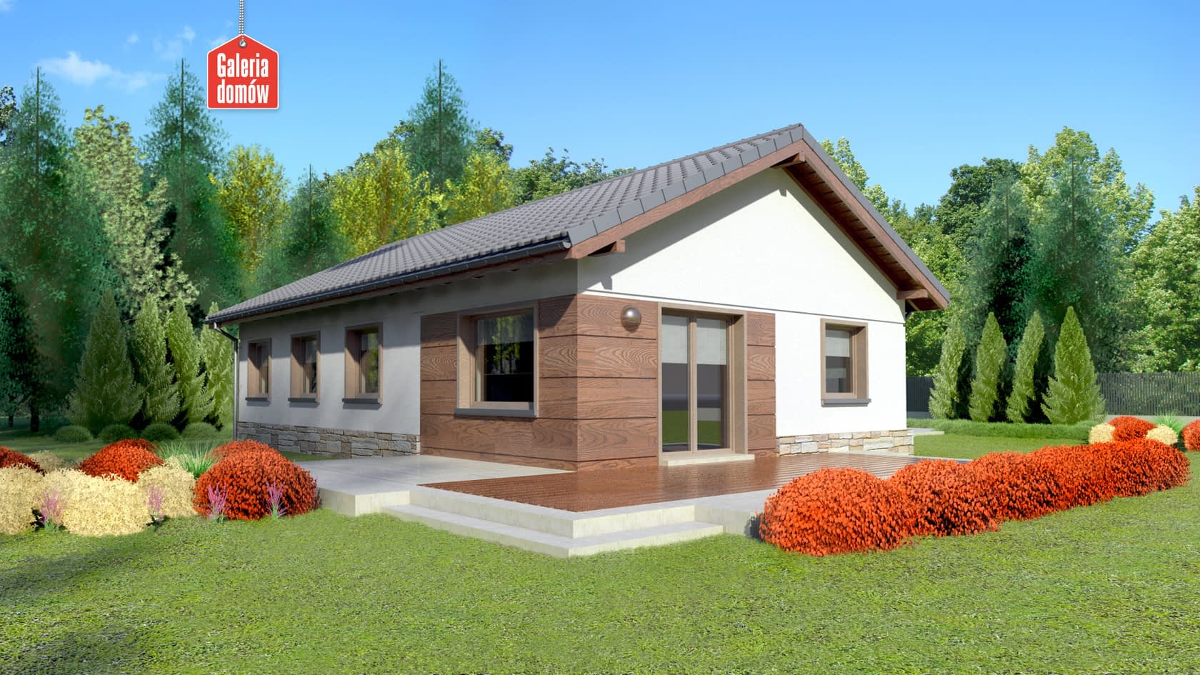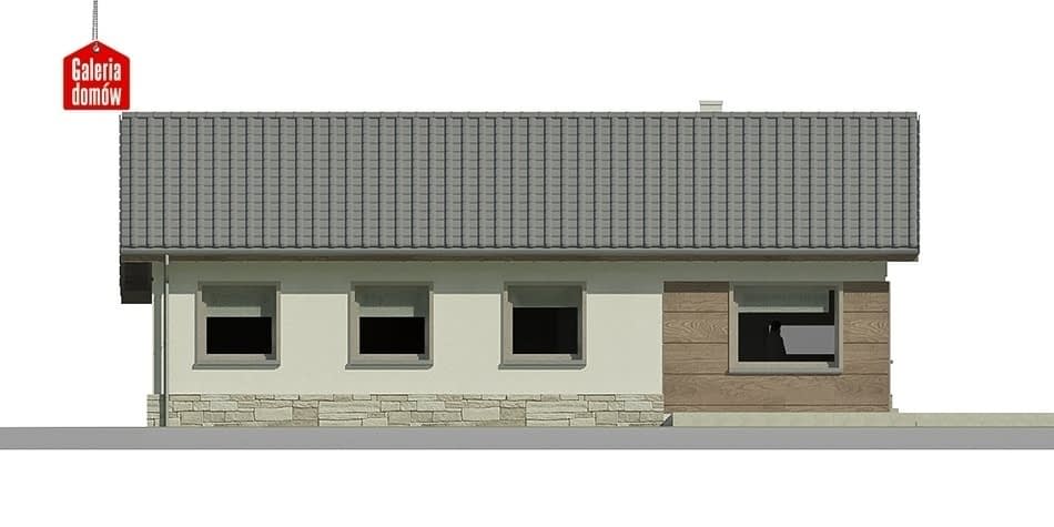 Parterowy, solidny dom blisko ziemi. Dla praktycznej rodziny, która znajdzie tu wszystko, co niezbędne do wygodnego życia. Projekt nie generuje wysokich kosztów na etapie budowy. Nie jest skomplikowany. Stylem nawiązuje do minimalistycznego budownictwa jednorodzinnego popularnego na północy Europy. Dobrze komponuje się z naturą. Jego zaletą jest prosta konstrukcja i użycie naturalnych materiałów (w tym przypadku okładziny kamiennej i drewnianej oblicówki na elewacji) oraz i zastosowanie dużych okien o regularnych kształtach. Posiada wygodny, dwustanowiskowy garaż.Konstrukcja