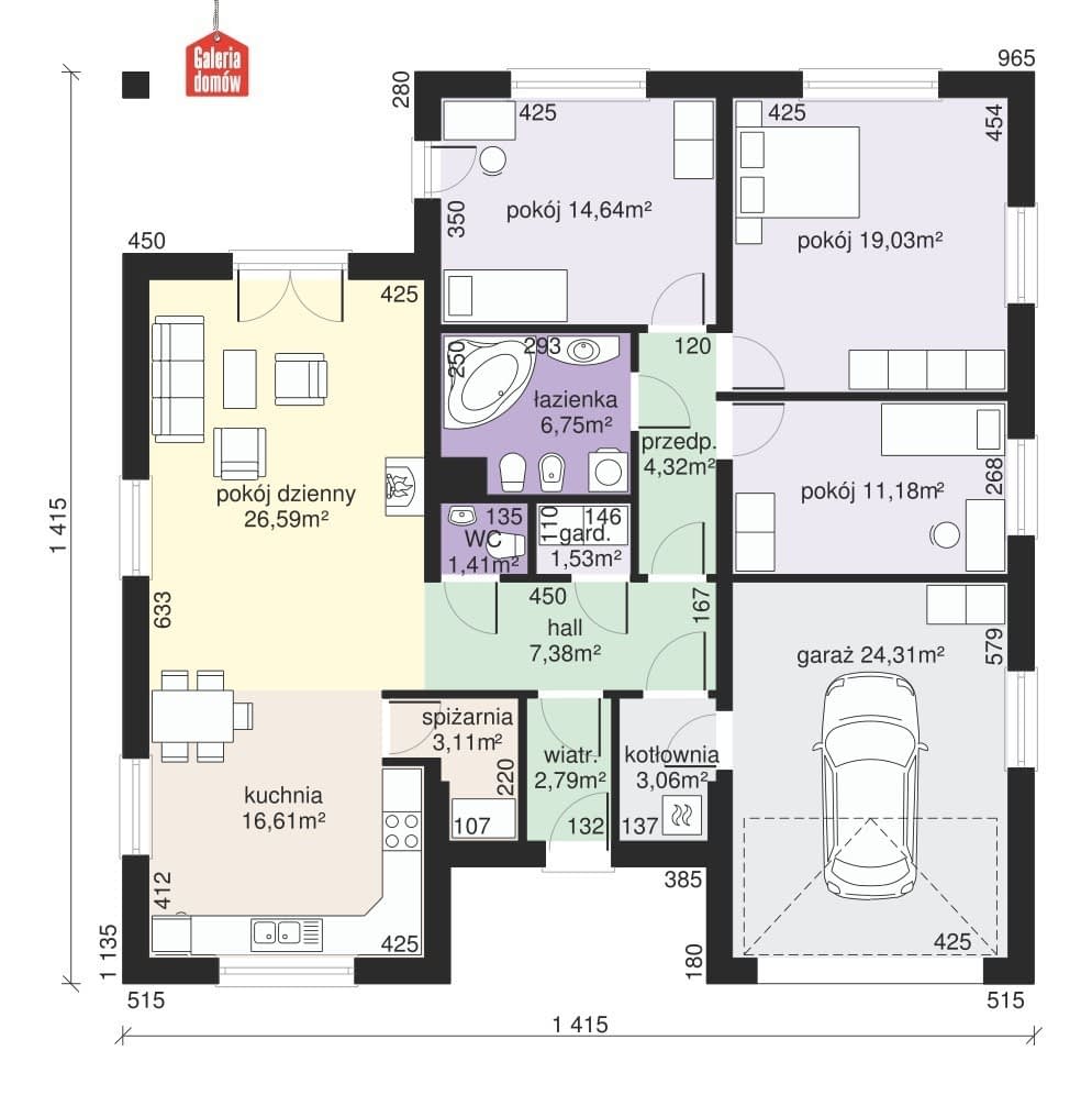 Nowoczesny, jasny i wygodny dom parterowy z garażem. Jego zaletą jest: nieskomplikowana bryła nakryta czterospadowym dachem, z wejściem i tarasem w podcieniu, oraz proste elewacje wykończone jasnym tynkiem i okładziną z naturalnego kamienia. Funkcjonalnie zaprojektowane wnętrze zapewnia komfort czteroosobowej rodzinie. Po lewej stronie kuchnia ze spiżarnią otwarta na salon z wyjściem do ogrodu tworzą część dzienną. Po prawej zlokalizowano część gospodarczą (kotłownia + garaż). Natomiast od strony ogrodu znajdują się trzy zaciszne sypialnie (oddziela je dodatkowo korytarz) ze wspólną łazienką.Konstrukcja