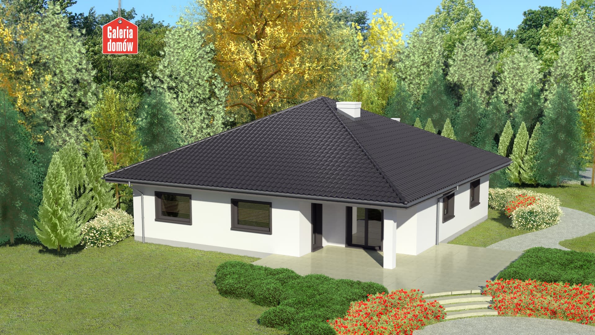 Nowoczesny, jasny i wygodny dom parterowy z garażem. Jego zaletą jest: nieskomplikowana bryła nakryta czterospadowym dachem, z wejściem i tarasem w podcieniu, oraz proste elewacje wykończone jasnym tynkiem i okładziną z naturalnego kamienia. Funkcjonalnie zaprojektowane wnętrze zapewnia komfort czteroosobowej rodzinie. Po lewej stronie kuchnia ze spiżarnią otwarta na salon z wyjściem do ogrodu tworzą część dzienną. Po prawej zlokalizowano część gospodarczą (kotłownia + garaż). Natomiast od strony ogrodu znajdują się trzy zaciszne sypialnie (oddziela je dodatkowo korytarz) ze wspólną łazienką.Konstrukcja