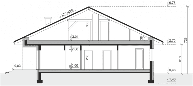Dach: kąt nachylenia 25°, pokrycie - dachówka ceramiczna lub betonowa.