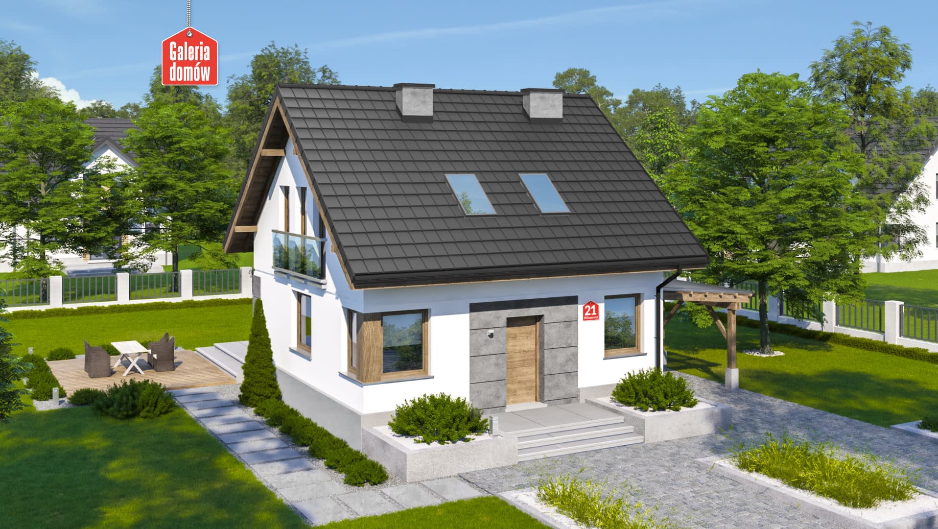 Dom przy Wiosennej 21 to nowoczesny, przytulny, elegancki i tani w budowie dom o niewielkich rozmiarach. Powierzchnia użytkowa wynosi 77,3 m². Parter stanowi otwarta przestrzeń dzienna z kuchnią i słonecznym pokojem. Atutem projektu jest dodatkowy pokój mogący służyć jako gabinet, lub sypialnia w przypadku budowy dwuetapowej.Zaplecze użytkowe stanowi łazienka, kotłownia, wiatrołap z wnękową szafą oraz funkcjonalna wiata na samochód. Poddasze zostało przeznaczone na strefę wypoczynku. Posiada 3 sypialnie i łazienkę. Każda z sypialni posiada drzwi na francuski balkon, które doskonale doświetlają poddasze i zapewniają kontakt ze świeżym powietrzem. Zwarta bryła, prosty dwuspadowy dach i niewielkie rozmiary sprawiają, iż Wiosenną 21 wybudujemy szybko i sprawnie. Dom należy do kategorii energooszczędnych i został opracowany zgodnie ze standardami WT2021. Mały dom z poddaszem dla inwestorów chcących tanio i szybko zamieszkać u siebie.Konstrukcja