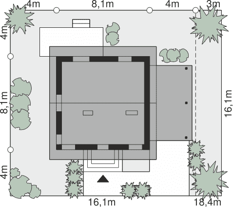 - Minimalne wymiary działki16.1 x 16.1m