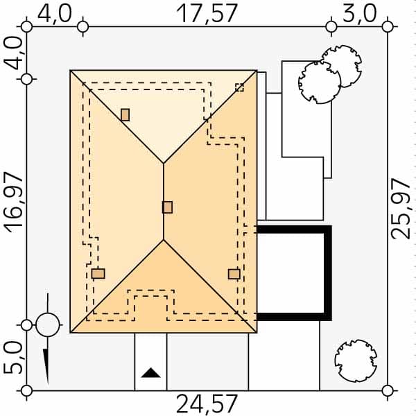 - Minimalne wymiary działki25.97 x 24.57m