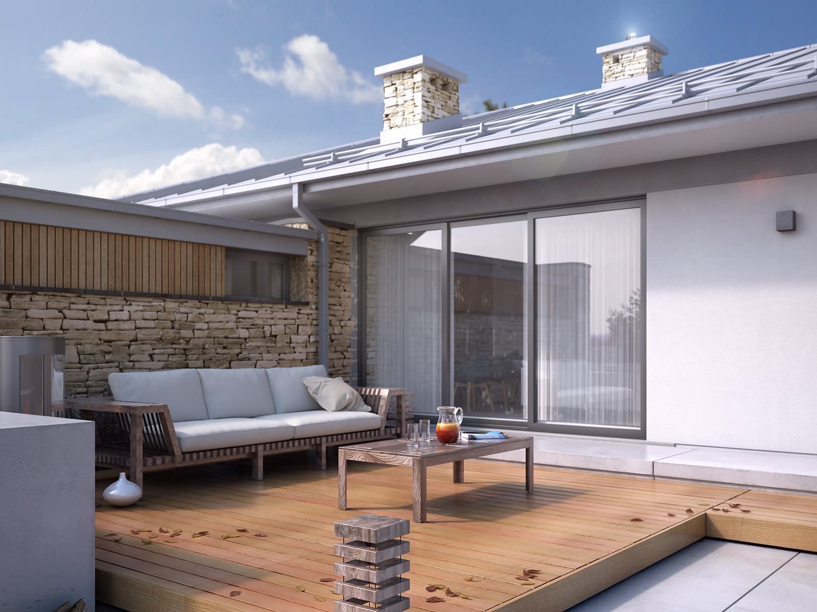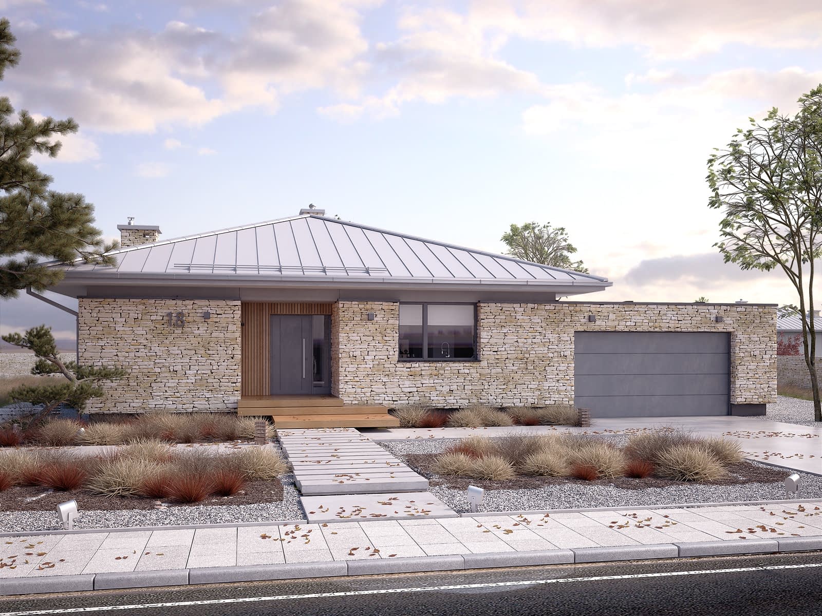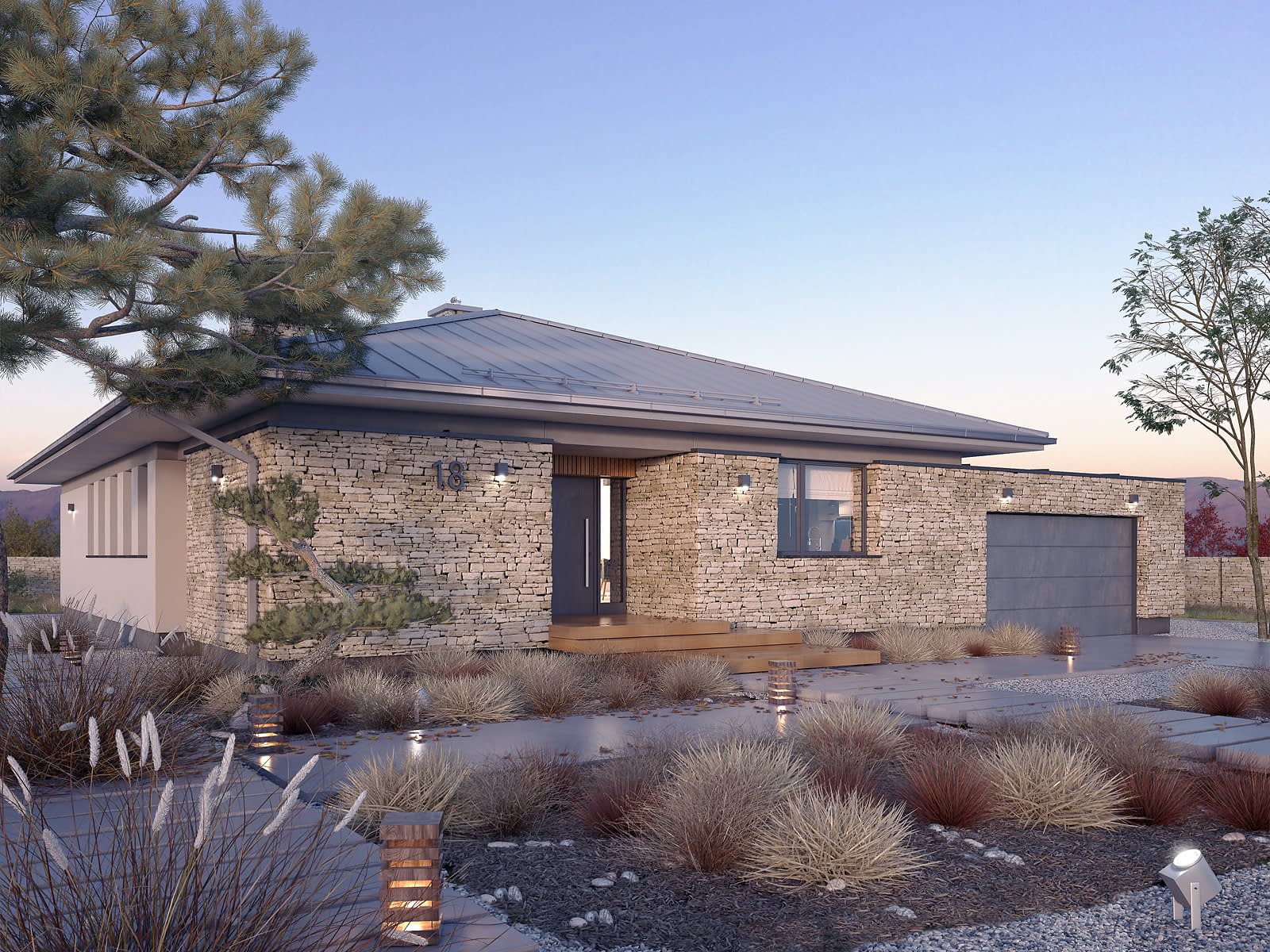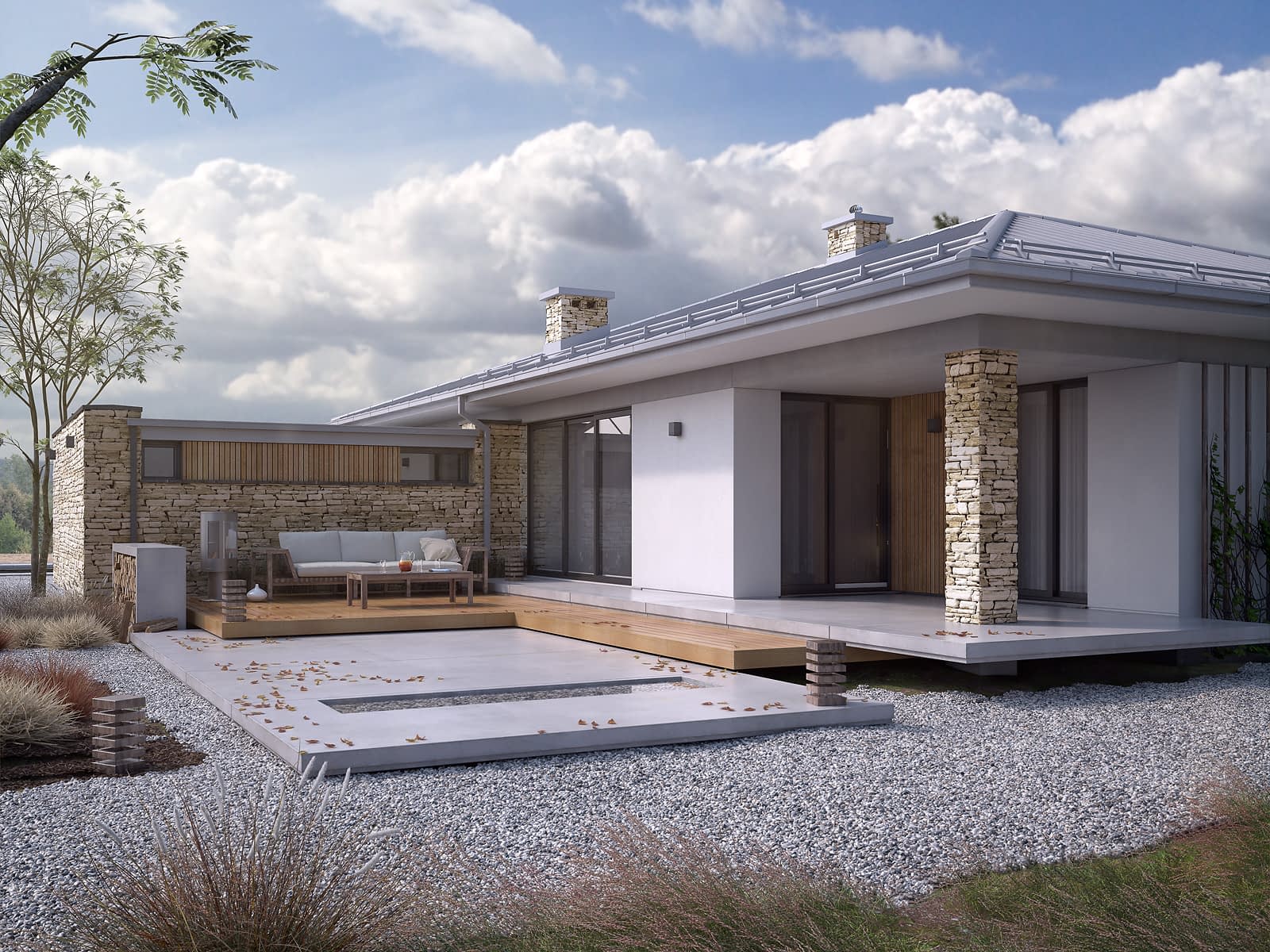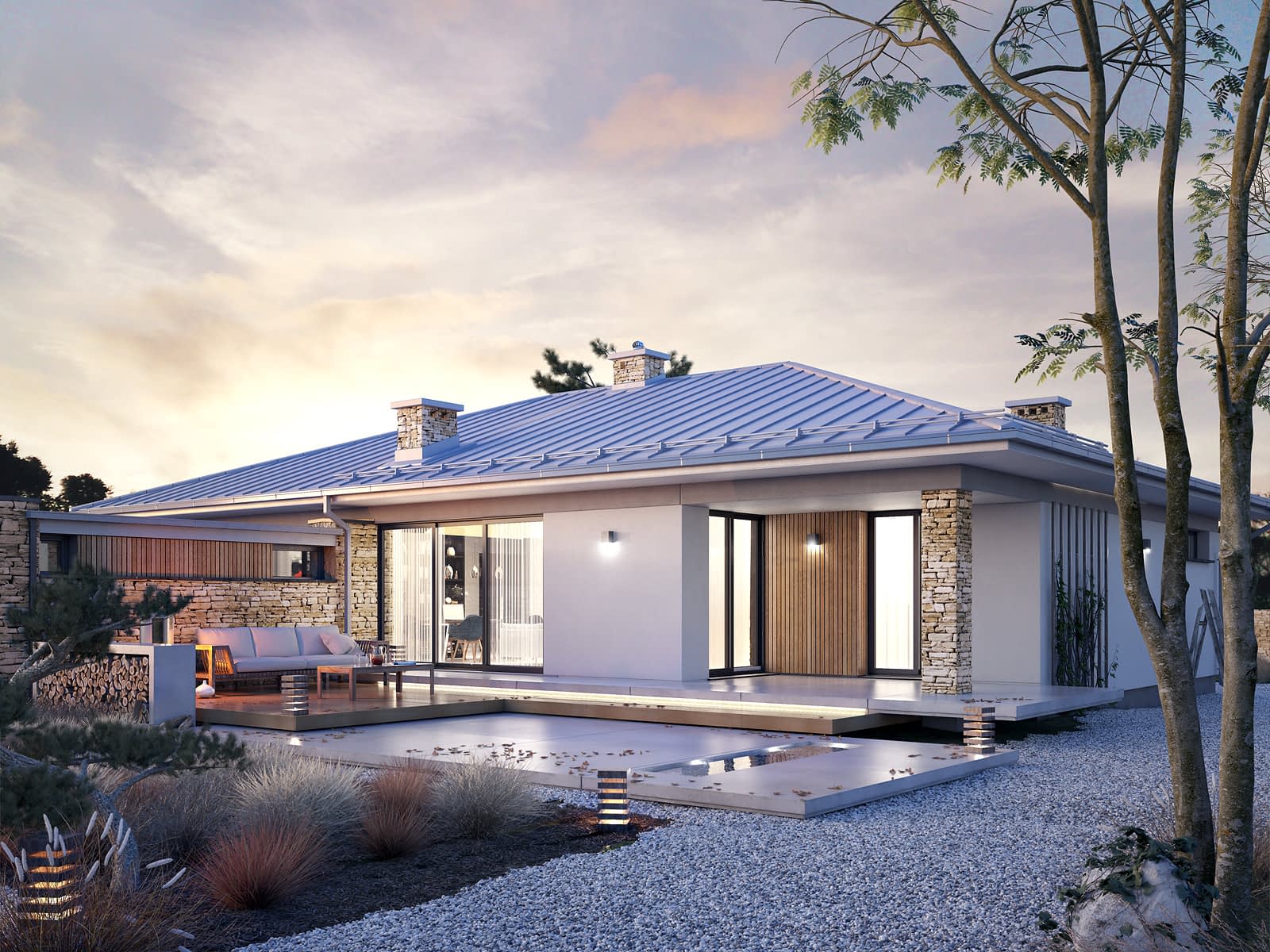 Feniks to projekt parterowego, reprezentacyjnego domu. Oszczędna, ale wysmakowana bryła i detal architektoniczny w połączeniu z fakturą kamienia tworzą eleganckie nawiązanie do modernistycznej architektury połowy XX wieku. Rozwiązania projektowe powstały z myślą o wygodnych warunkach mieszkalnych dla 4-osobowej rodziny. Zaproponowano otwarty układ funkcjonalny z wydzieleniem strefy prywatnej. W budynku przewidziano również różnorodną przestrzeń pomocniczą i gospodarczą, taką jak dwustanowiskowy garaż, duża kotłownia, garderoby czy spiżarnia połączona z kuchnią. Dzięki osłonięciu częściowo zadaszonych tarasów bryłami budynku, w ogrodzie uzyskano prywatną strefę wypoczynku i rekreacji.Konstrukcja
