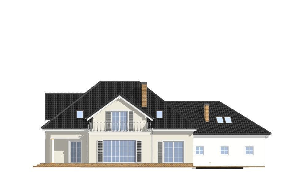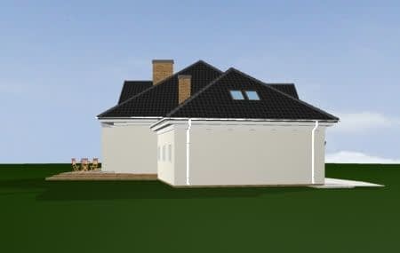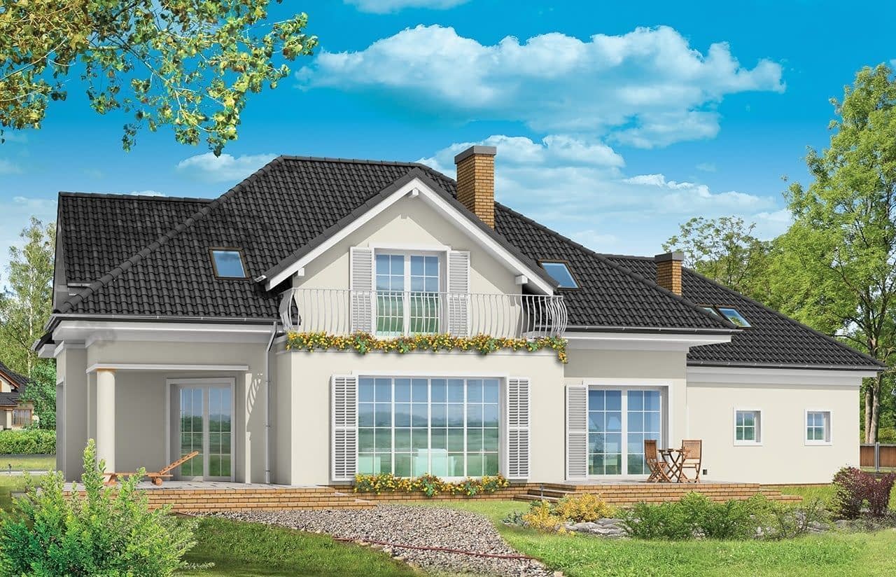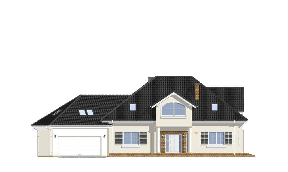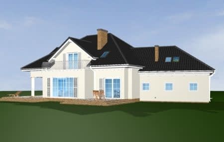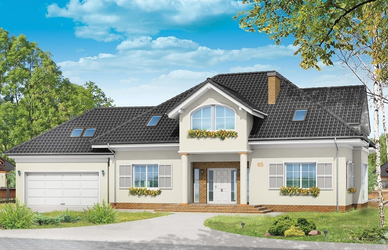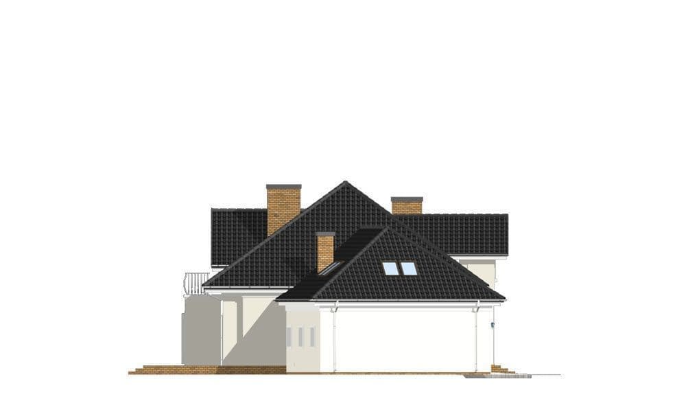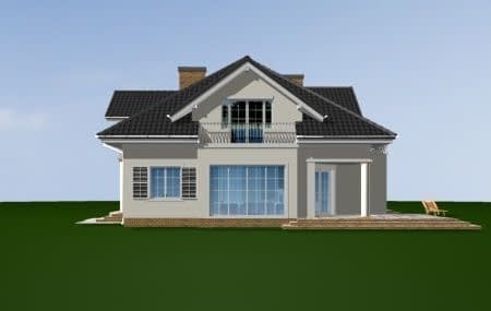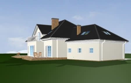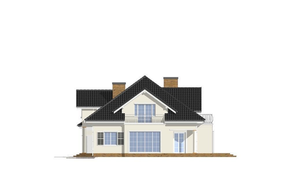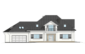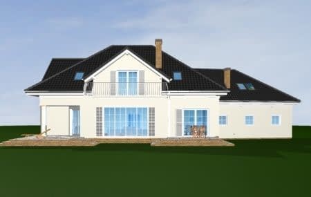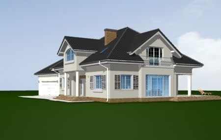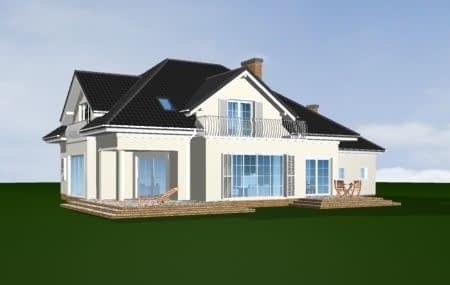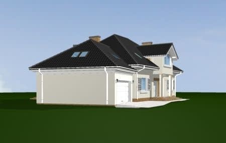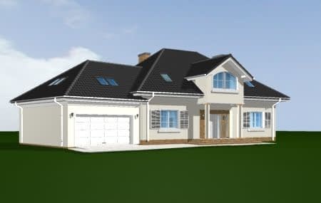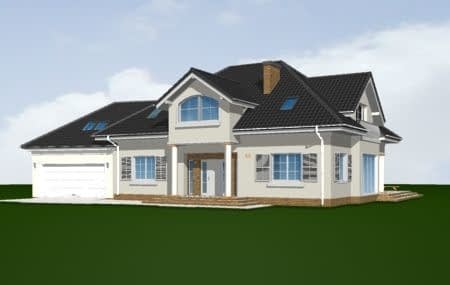 Projekt domu Dom Z Kolumnami to budynek stworzony na bazie domu Benedykt. Dostojny, parterowy dom z poddaszem użytkowym, wielospadowymi dachami i szerokimi lukarnami. Dobudowana do głównej bryły budynku część garażowa została zaprojektowana pod kątem tak, aby stworzyć wrażenie dziedzińca frontowego z wejściem do domu i wjazdem do garażu skierowanymi do jednego centralnego punktu. W Domu Z Kolumnami, prócz mieszkania dla 4-5cio osobowej rodziny zaprojektowano również dodatkowo pokój z aneksem kuchennym i łazienką dla starszej osoby. Projekt domu Dom Z Kolumnami zatem może służyć jako siedziba trzypokoleniowej rodziny. Na parterze zaplanowano duży salon połączony z jadalnią i holem, oraz z częściowo otwartą kuchnią. Z salonu możemy podziwiać ogród przez dwa duże przeszklenia w wykuszach. Możemy również wyjść na taras i podcień. Na parterze zaplanowano dodatkowo gabinet blisko wejścia. Pomieszczenia techniczne umieszczono w części garażowej. Na poddaszu zaprojektowano trzy sypialnie i dwie łazienki. Jedna sypialnia stanowi odrębny apartament rodziców z garderobą i łazienką. Dodatkowo w Domu z Kolumnami przewidziano pralnio-suszarnię (mogącą być również dodatkowym pokojem), oraz strych nad garażem, który można przewidzieć na pokój sportowy lub np. kino domowe.