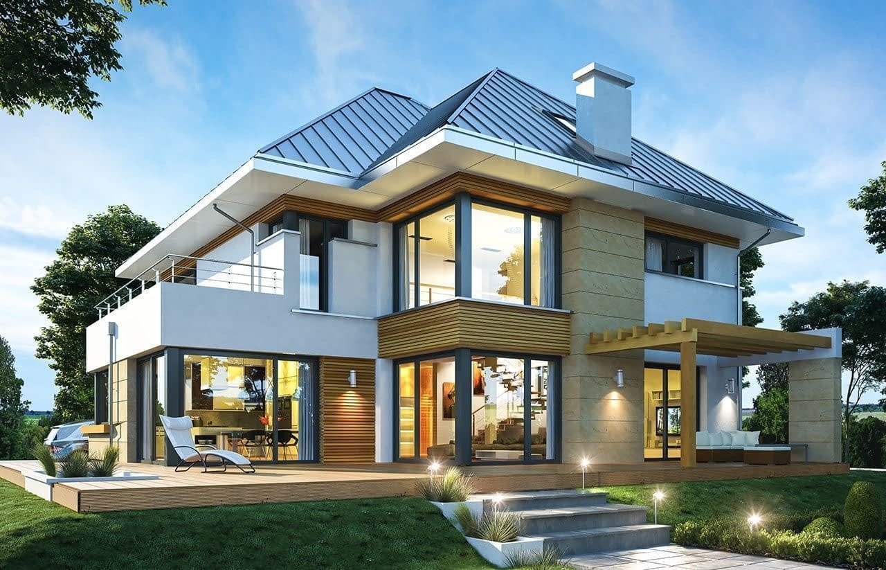 Projekt domu Dom z widokiem 2 C to projekt piętrowego domu jednorodzinnego o nowoczesnej architekturze, z kolekcji popularnych „Domów z widokiem”. Budynek został złożony z dwóch zasadniczych brył - z piętrowego rdzenia, przykrytego dachem w kształcie litery „L”, oraz parterowej bryły garażu przekrytego trzyspadowym dachem. Z uwagi na dość duży kąt nachylenia dachów, nad piętrem mieści się jeszcze spory strych, który można z powodzeniem zaadaptować na poddasze użytkowe z dodatkowymi pomieszczeniami. Bryła budynku ozdobiona jest ładnym detalem. Narożne okna, duże przeszklenia, kamienne i drewniane okładziny ścian - wszystkie te elementy dodają elewacjom domu szyku i elegancji. Budynek ma reprezentacyjny wygląd - przywołuje na myśl wrażenie komfortu i luksusu, a także solidności i trwałości zastosowanych materiałów i rozwiązań. Wnętrze zostało zaprojektowane z podziałem na przestrzeń dzienną i gospodarczą na parterze, oraz sypialnie na piętrze. Do domu wchodzimy dobrze oświetlonym przedsionkiem z szatnią, od razu do ładnego holu, a dalej do salonu z pustką i pięknymi reprezentacyjnymi schodami, oraz dużej kuchni z wyspą, oraz jadalnią. W części gospodarczej na parterze mamy dwustanowiskowy garaż z dodatkową przestrzenią magazynową, oraz osobną kotłownię. Salon i jadalnia otwierają się dużymi przeszkleniami na szeroki taras częściowo osłonięty pergolą. Z narożnego okna kuchni widzimy wejście i wjazd do domu. Na piętrze zaprojektowano apartament rodziców z garderobą, łazienką i własnym tarasem dostępnym z sypialni, oraz dwie sypialnie dziecięce z łazienką . Hol na piętrze pełni też funkcję antresoli nad salonem, w estetyczny sposób łącząc ze sobą górę i dół. Nad garażem mamy dużą dodatkową przestrzeń strychową, którą można wykorzystać w dowolny sposób. Na poddaszu nad piętrem mamy jeszcze ponad 60-metrowe studio, które również może być w łatwy sposób zaadaptowane na przestrzeń użytkową domu. Projekt domu Dom z widokiem 2 C to doskonała propozycja dla Inwestorów chcących dużego domu , ale mających ograniczenia powierzchni zabudowy lub niewielkiej działki, a do tego obowiązek budowy domu z dachem o większym kącie nachylenia połaci. Projekt domu Dom z widokiem 2 C doskonale pasować będzie na działkę z ogródkiem z boku, oraz na działkę z wjazdem na posesję od strony nasłonecznionej - na przykład od południa. W budynku zastosowano energooszczędne materiały i technologie, dzięki czemu dom będzie niedrogi w późniejszej eksploatacji. Zapraszamy do zapoznania się z pełną ofertą pracowni MG Projekt tej serii: Dom z widokiem, Dom z widokiem 2, Dom z widokiem 3, Dom z widokiem 3F, Dom z widokiem 4, Dom z widokiem 5, Dom z widokiem 6, Dom z widokiem 6B, Dom z widokiem B, Dom z widokiem E.