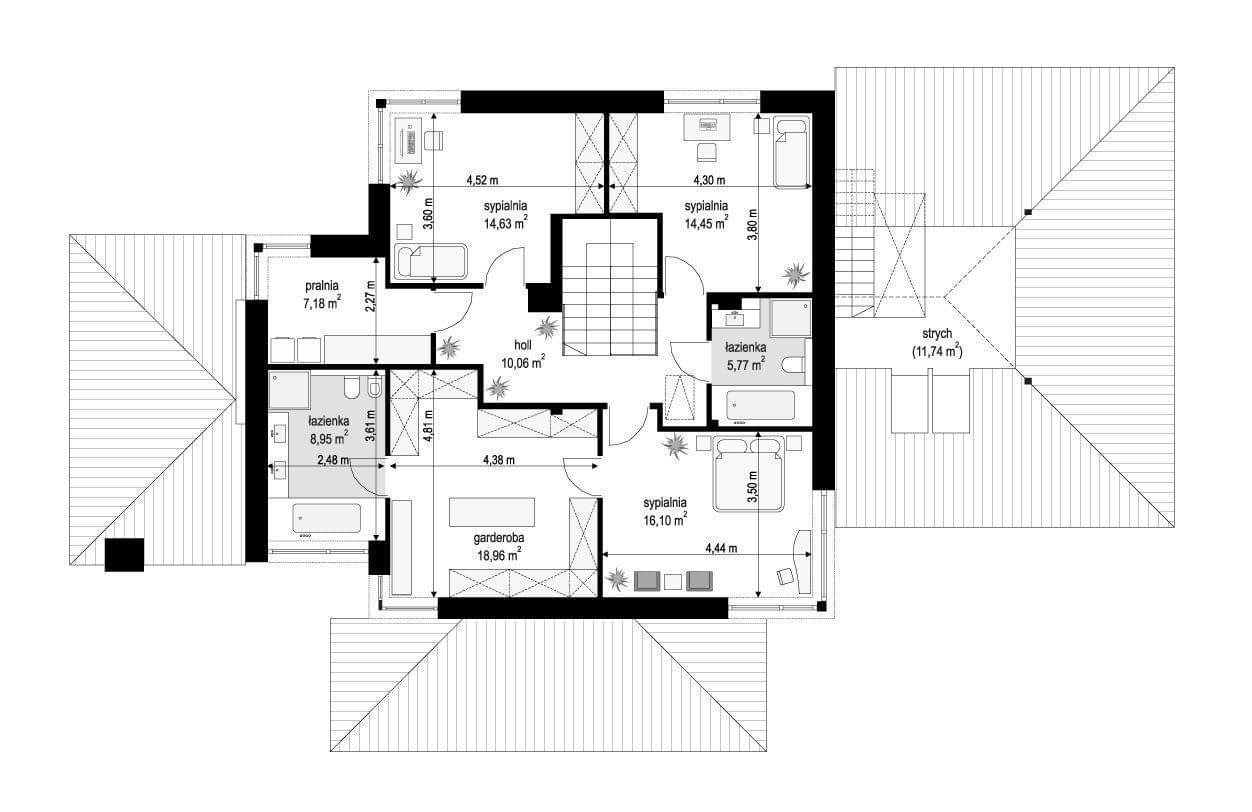 - Zmianę funkcji, ilości i usytuowania poszczególnych pomieszczeń na dowolnej kondygnacji w projekcie.