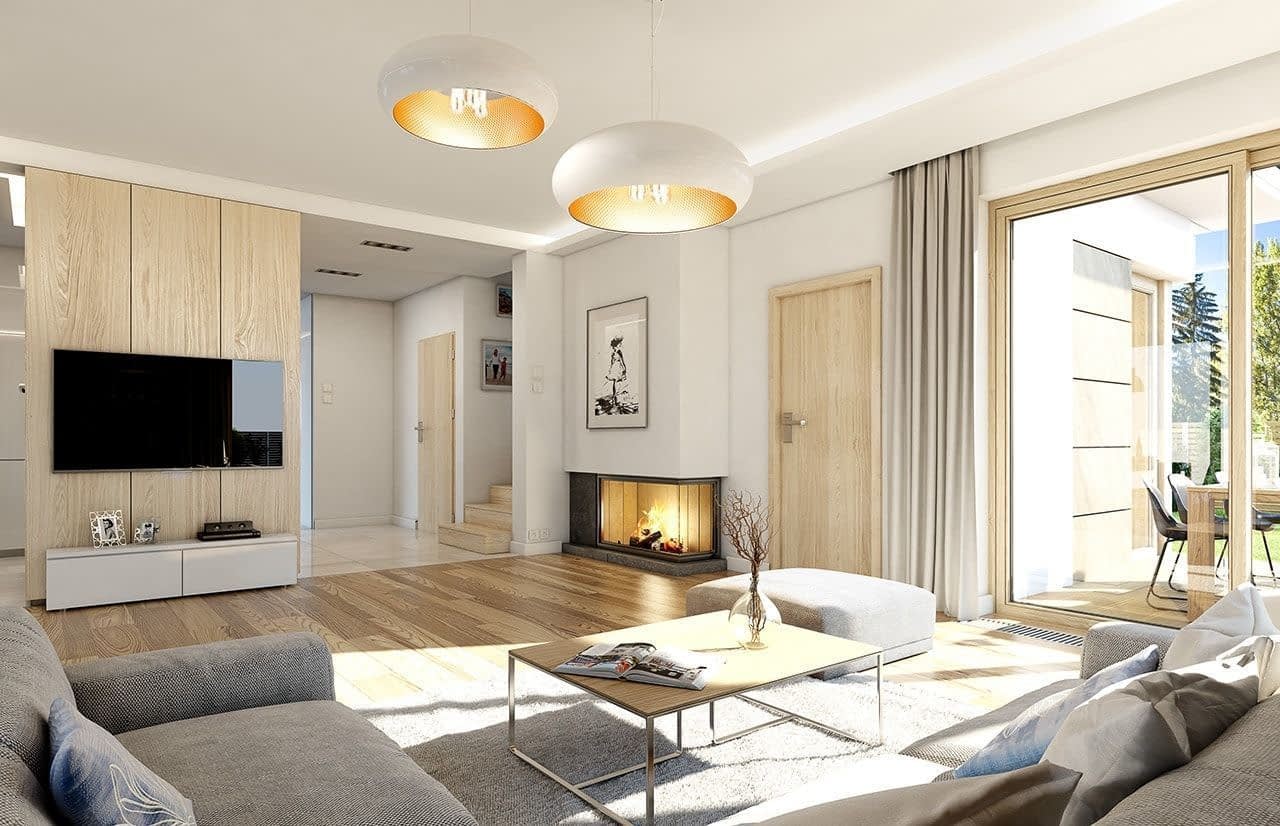 Projekt domu Dom z widokiem 5 to nowość z cieszącej się popularnością serii projektów „Dom z widokiem”, najmniejszy wariant tego projektu. Dom przy niewielkiej powierzchni i umiarkowanych kosztach budowy zawiera większość elementów i detali architektonicznych pierwotnego projektu, a jednocześnie ma wygodne i funkcjonalne wnętrze. Projekt domu Dom z widokiem 5 to budynek piętrowy, przykryty wielospadowym dachem. Jego główna bryła ma dach kopertowy. Do rdzenia domu dobudowano fragment piętrowy, oraz kilka parterowych części : nad garażem, kuchnią czy nad zadaszeniem tarasu. Całość sylwetki domu to jest atrakcyjna i nowoczesna, ozdobiona ciekawymi detalami, kamiennymi okładzinami ścian i dużymi przeszkleniami otwierającymi wnętrze na ogród. Wejście do domu zaakcentowano narożnym podcieniem i szerokimi drzwiami z naświetlami. Narożne okno kuchenne daje szeroki widok na podjazd i wejście na działkę. Elewacja ogrodowa to przede wszystkim piękne narożne okna salonu i sypialni rodziców powyżej, oraz praktyczne zadaszenie nad częścią tarasu. Wnętrze : na parter wchodzimy przez przestronny przedsionek z szatnią i przejściem do garażu, oraz kotłowni, wprost do holu otwierającego się na salon i reprezentacyjne schody. Kuchnia ze spiżarką znajduje się blisko wejścia. Salon z wydzielonym aneksem jadalnym otwiera dom na otaczający go taras. Na parterze znajduje się jeszcze dodatkowy pokój - np. gabinet. Na piętrze mamy trzy sypialnie i dwie łazienki oraz pralnię. Sypialnie dzieci mają wbudowane szafy. Sypialnia rodziców to osobny apartament z własną łazienką i garderobą, oraz pięknym widokiem na ogród. Projekt domu Dom z widokiem 5 jest zgrabny i praktyczny - jest spełnieniem marzeń o podmiejskiej wilii dla Inwestorów, którzy nie planują wydać na nią dużych pieniędzy, lub nie dysponują zbyt wielką działką. Dom jest energooszczędny, dość prosty i niedrogi w budowie. Bardzo łatwo można przystosować projekt do standardu NF40. Zapraszamy do zapoznania się z pełną ofertą pracowni MG Projekt tej serii: Dom z widokiem, Dom z widokiem 2, Dom z widokiem 2C, Dom z widokiem 3, Dom z widokiem 3F, Dom z widokiem 4, Dom z widokiem 6, Dom z widokiem 6B, Dom z widokiem B, Dom z widokiem E.