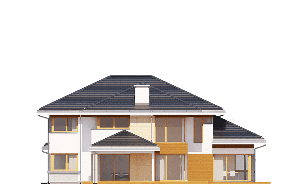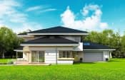Projekt domu Dom z widokiem jest luksusową, nowoczesną willą jednorodzinną, przeznaczoną dla 4-6 domowników. Projekt domu Dom z Widokiem nadaje się do budowy nawet na działce z niekorzystnym usytuowaniem w stosunku do stron świata. Dom z Widokiem zaprojektowany został jako rozłożysta piętrowa rezydencja, połączona z otaczającym ogrodem licznymi przeszkleniami, oraz otwartymi i zadaszonymi tarasami.Bryła Domu z WidokiemBryła Domu z Widokiem składa się z zasadniczej części piętrowej i trzech parterowych skrzydeł, tworzących w całości układ litery "T". Projekt Dom z Widokiem jest na tyle uniwersalny, że może być postawiony na każdej działce. Część wejściowo-wjazdowa i część tarasowa od strony salonu tworzą dwa osobne półotwarte dziedzińce: frontowy i ogrodowy. Duże narożne okna z rzadkimi podziałami stanowią wizytówkę Domu z Widokiem. Elewację urozmaicają liczne detale, okładziny z piaskowca, boniowania tynku i drewniane wykończenia. Całość przykryta jest łagodnym dachem z szerokimi okapami. Projekt Dom z Widokiem ma nowoczesną, ale stonowaną architekturę. Emanuje z niej spokój i elegancja. Dzięki połączeniu dobrych sprawdzonych detali architektura domu z widokiem nigdy się nie zestarzeje i nie wyjdzie z mody. Jednymi z głównych atrakcji Domu z Widokiem są jego duże przeszklenia, a największą atrakcją jest dwukondygnacyjny szklany narożnik salonu, łączący pokój dzienny z pustką z tarasem i ogrodem. Pozostałe przeszklenia: w jadalni, w kuchni, sypialniach, czy przy wejściu do domku, dodatkowo potęgują efekt otwartości wnętrza.Dom z Widokiem wnętrzePrzestrzeń jest luksusem i wnętrze Domu z Widokiem zaprojektowano kierując się tą właśnie myślą. Parter budynku mieszkalnego to w dużej mierze otwarta duża część dzienna - salon, jadalnia, hol, kuchnia. Na parterze zmieściliśmy dodatkowy pokój - gabinet lub sypialnię gościnną. Piętro to sypialnie rodziców i dzieci z łazienkami i garderobami. Na piętrze mieści się duża antresola nad salonem, którą można wykorzystać jako dodatkowy pokój. Funkcjonalnie zaprojektowane wnętrze Domu z Widokeim zapewnia wygodne mieszkanie wszystkim domownikom. Projekt domu Dom z widokiem to dom dla osób wyjątkowych, z wizją, z pragnieniem życia w nietuzinkowym otoczeniu, wśród pięknych wnętrz.Dom z Widokiem jest energooszczędny, więc będzie tani w użytkowaniu. Kosztorysanci MG Projekt oszacowali koszty budowy domu Dom z Widokiem do stanu surowego zamkniętego na 381743 zł. Projekt domu Dom z Widokiem dostępny jest w odbiciu lustrzanym, kilku wariantach oraz w innych wersjach domu z widokiem: Dom z widokiem 2, Dom z widokiem 2C, Dom z widokiem 3, Dom z widokiem 3F, Dom z widokiem 4, Dom z widokiem 5, Dom z widokiem 6, Dom z widokiem 6B, Dom z widokiem B, Dom z widokiem E.
