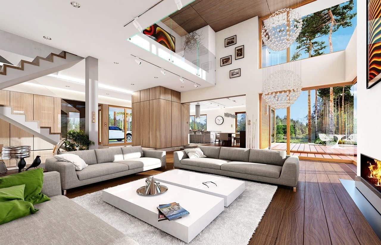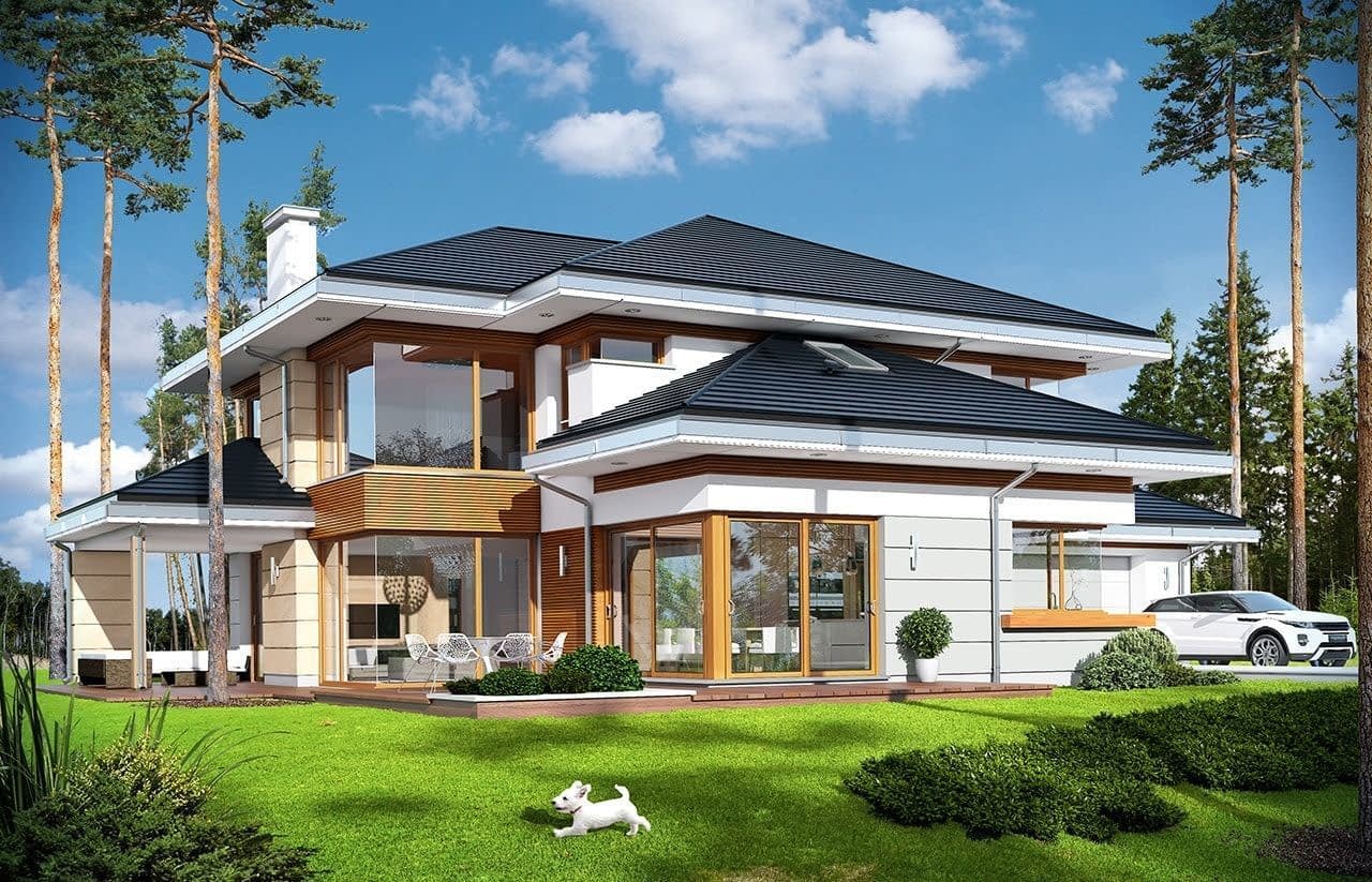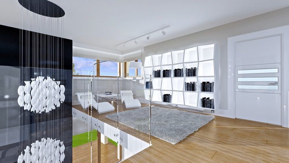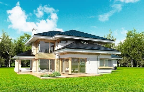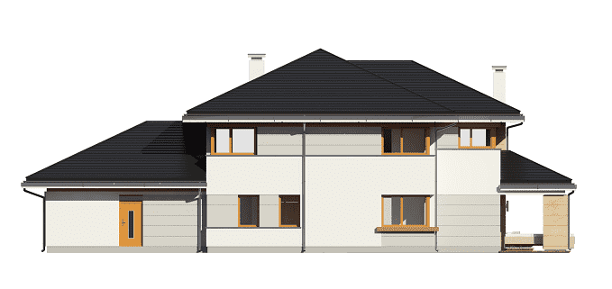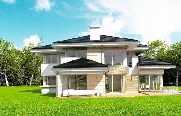 Projekt domu Dom z widokiem jest luksusową, nowoczesną willą jednorodzinną, przeznaczoną dla 4-6 domowników. Projekt domu Dom z Widokiem nadaje się do budowy nawet na działce z niekorzystnym usytuowaniem w stosunku do stron świata. Dom z Widokiem zaprojektowany został jako rozłożysta piętrowa rezydencja, połączona z otaczającym ogrodem licznymi przeszkleniami, oraz otwartymi i zadaszonymi tarasami.Bryła Domu z WidokiemBryła Domu z Widokiem składa się z zasadniczej części piętrowej i trzech parterowych skrzydeł, tworzących w całości układ litery "T". Projekt Dom z Widokiem jest na tyle uniwersalny, że może być postawiony na każdej działce. Część wejściowo-wjazdowa i część tarasowa od strony salonu tworzą dwa osobne półotwarte dziedzińce: frontowy i ogrodowy. Duże narożne okna z rzadkimi podziałami stanowią wizytówkę Domu z Widokiem. Elewację urozmaicają liczne detale, okładziny z piaskowca, boniowania tynku i drewniane wykończenia. Całość przykryta jest łagodnym dachem z szerokimi okapami. Projekt Dom z Widokiem ma nowoczesną, ale stonowaną architekturę. Emanuje z niej spokój i elegancja. Dzięki połączeniu dobrych sprawdzonych detali architektura domu z widokiem nigdy się nie zestarzeje i nie wyjdzie z mody. Jednymi z głównych atrakcji Domu z Widokiem są jego duże przeszklenia, a największą atrakcją jest dwukondygnacyjny szklany narożnik salonu, łączący pokój dzienny z pustką z tarasem i ogrodem. Pozostałe przeszklenia: w jadalni, w kuchni, sypialniach, czy przy wejściu do domku, dodatkowo potęgują efekt otwartości wnętrza.Dom z Widokiem wnętrzePrzestrzeń jest luksusem i wnętrze Domu z Widokiem zaprojektowano kierując się tą właśnie myślą. Parter budynku mieszkalnego to w dużej mierze otwarta duża część dzienna - salon, jadalnia, hol, kuchnia. Na parterze zmieściliśmy dodatkowy pokój - gabinet lub sypialnię gościnną. Piętro to sypialnie rodziców i dzieci z łazienkami i garderobami. Na piętrze mieści się duża antresola nad salonem, którą można wykorzystać jako dodatkowy pokój. Funkcjonalnie zaprojektowane wnętrze Domu z Widokeim zapewnia wygodne mieszkanie wszystkim domownikom. Projekt domu Dom z widokiem to dom dla osób wyjątkowych, z wizją, z pragnieniem życia w nietuzinkowym otoczeniu, wśród pięknych wnętrz.Dom z Widokiem jest energooszczędny, więc będzie tani w użytkowaniu. Kosztorysanci MG Projekt oszacowali koszty budowy domu Dom z Widokiem do stanu surowego zamkniętego na 381743 zł. Projekt domu Dom z Widokiem dostępny jest w odbiciu lustrzanym, kilku wariantach oraz w innych wersjach domu z widokiem: Dom z widokiem 2, Dom z widokiem 2C, Dom z widokiem 3, Dom z widokiem 3F, Dom z widokiem 4, Dom z widokiem 5, Dom z widokiem 6, Dom z widokiem 6B, Dom z widokiem B, Dom z widokiem E.