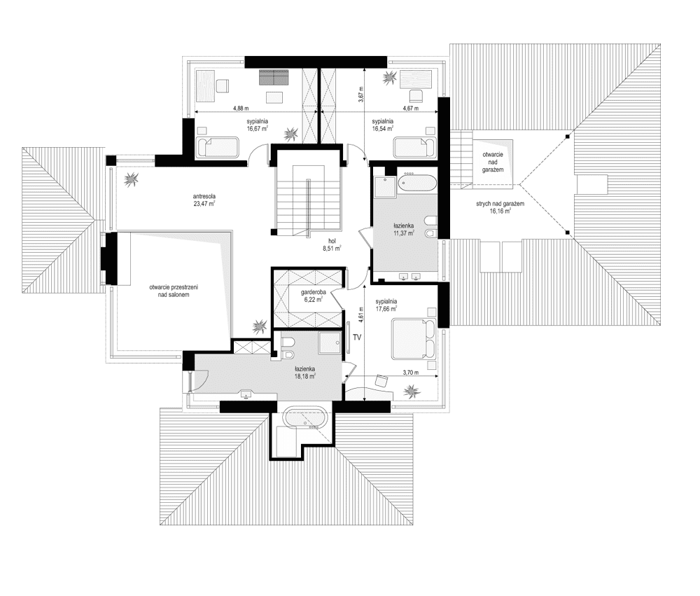 - Zmianę ukształtowania, ilości i kąta nachylenia połaci dachowych.