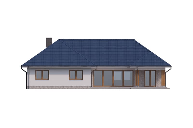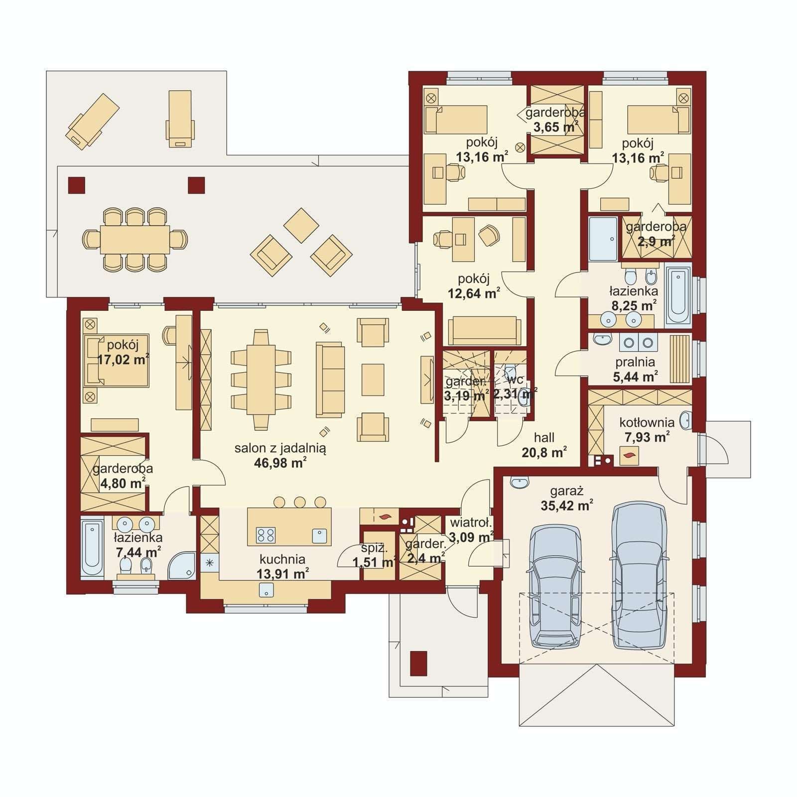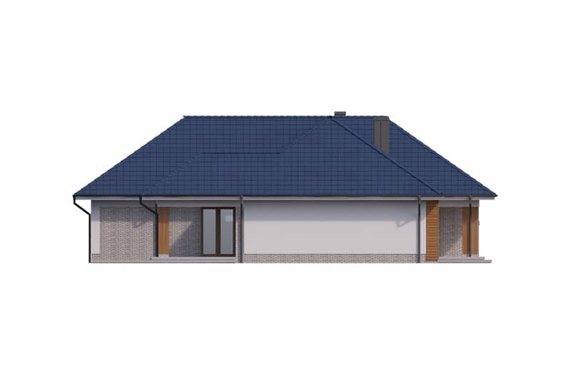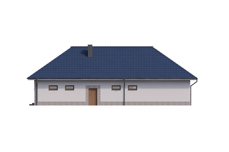 Dom zachwyca reprezentacyjnym salonem z jadalnią i otwartą kuchnią ze spiżarnią, którą można w razie potrzeby wydzielić jako osobne pomieszczenie. Ekskluzywnym rozwiązaniem jest intymna strefa głównej sypialni z własną łazienką i garderobą oraz bezpośrednim dostępem do części dziennej i zadaszonego tarasu. Przy przejściu do zacisznej części nocnej znajduje się toaleta i podręczna garderoba, za którymi znajdują się trzy sypialnie w tym dwie z własnymi garderobami oraz łazienka i pralnia. Układ funkcjonalny dopełnia duży, wygodny garaż z przejściem do obszernego pomieszczenia gospodarczego z praktycznym wyjściem do ogrodu.