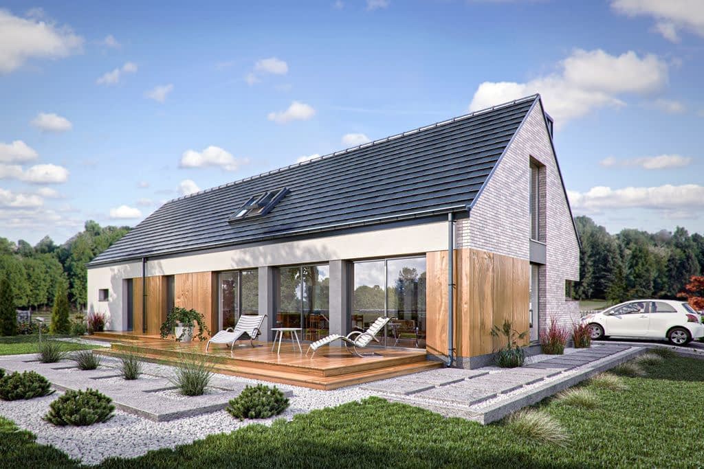 Wizualizacja jest propozycją tego jak dany projekt domu oraz jego otoczenie można zaaranżować. Sposób prowadzenia tarasu, kształt murków i elementy małej architektury typu pergole, donice itp. nie są objęte zakresem projektu. W związku z powyższym na projekcie budowlanym elementy te mogą nie być uwzględnione w projekcie ( patrz pergole ) lub zmieniony może być ich kształt i sposób prowadzenia ( wielkości tarasów, profil murków )