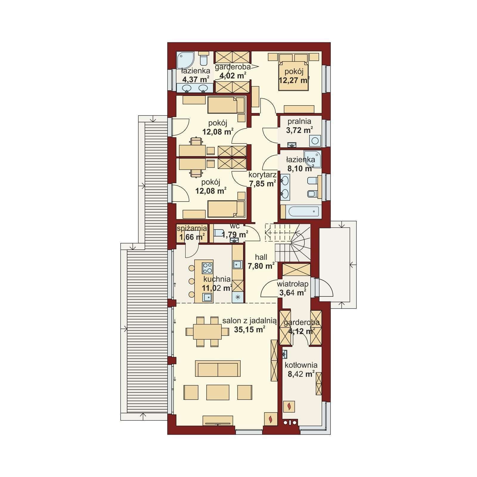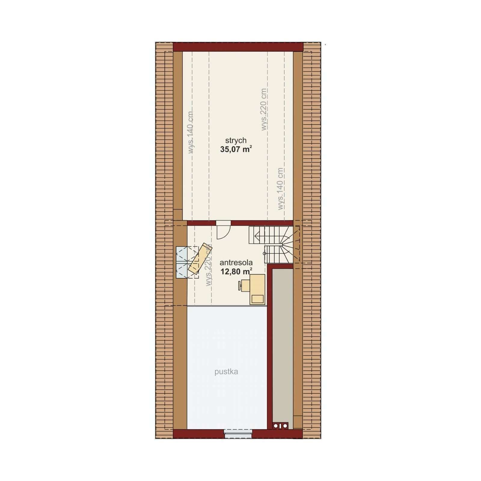 Przedsionek z miejscem na szafę otwiera się na strefę dzienną, składającą się z przestronnego salonu połączonego z jadalnią oraz, łatwą do wydzielenia, kuchnią ze spiżarnią. Z korytarza mamy dostęp do dwóch pokoi, łazienki, pralni oraz sypialni małżeńskiej, do której znów przylegają garderoba i kolejna łazienka. Schody prowadzą na antresolę, z której jest dostęp do strychu.