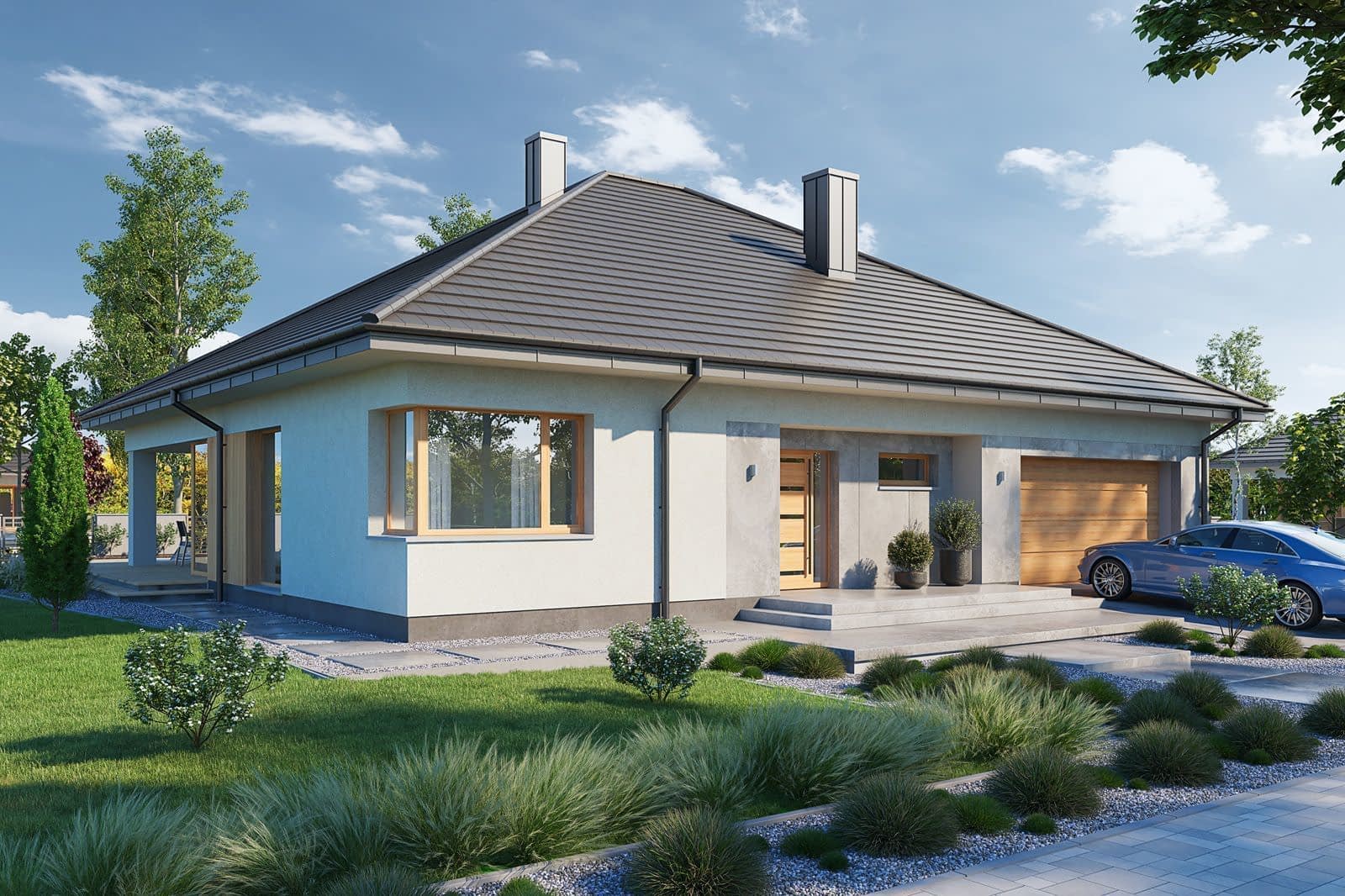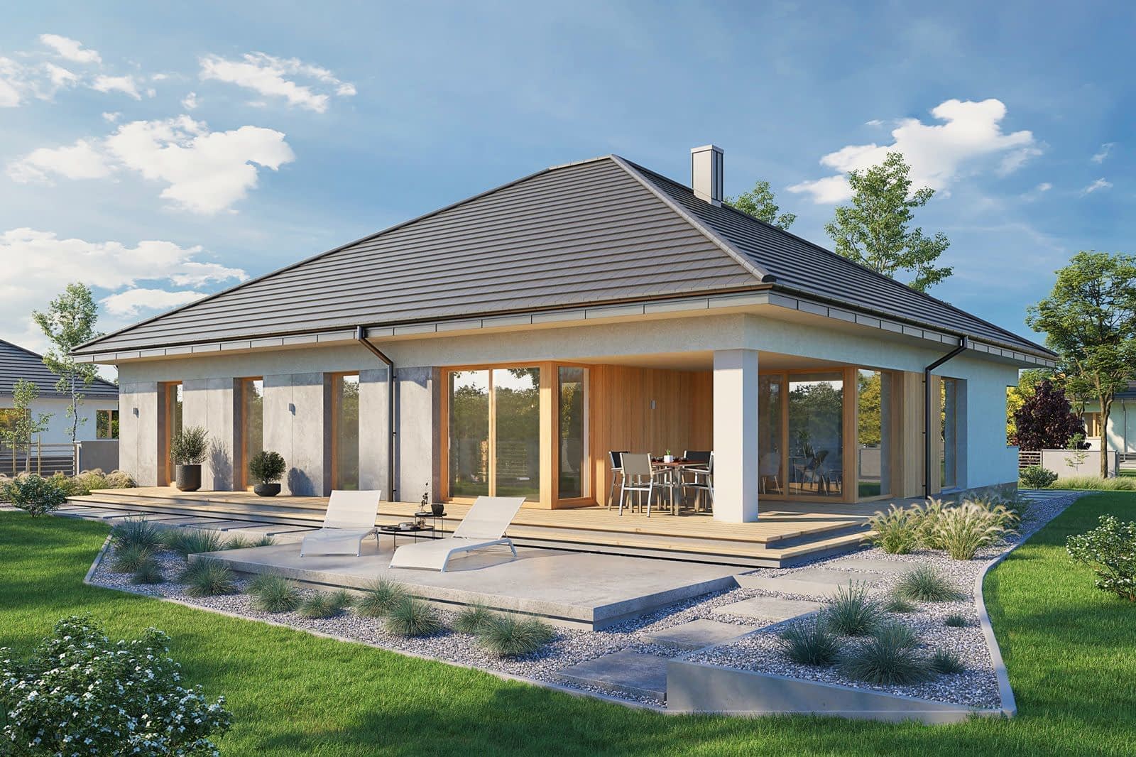 Wizualizacja jest propozycją tego jak dany projekt domu oraz jego otoczenie można zaaranżować. Sposób prowadzenia tarasu, kształt murków i elementy małej architektury typu pergole, donice itp. nie są objęte zakresem projektu. W związku z powyższym na projekcie budowlanym elementy te mogą nie być uwzględnione w projekcie ( patrz pergole ) lub zmieniony może być ich kształt i sposób prowadzenia ( wielkości tarasów, profil murków )