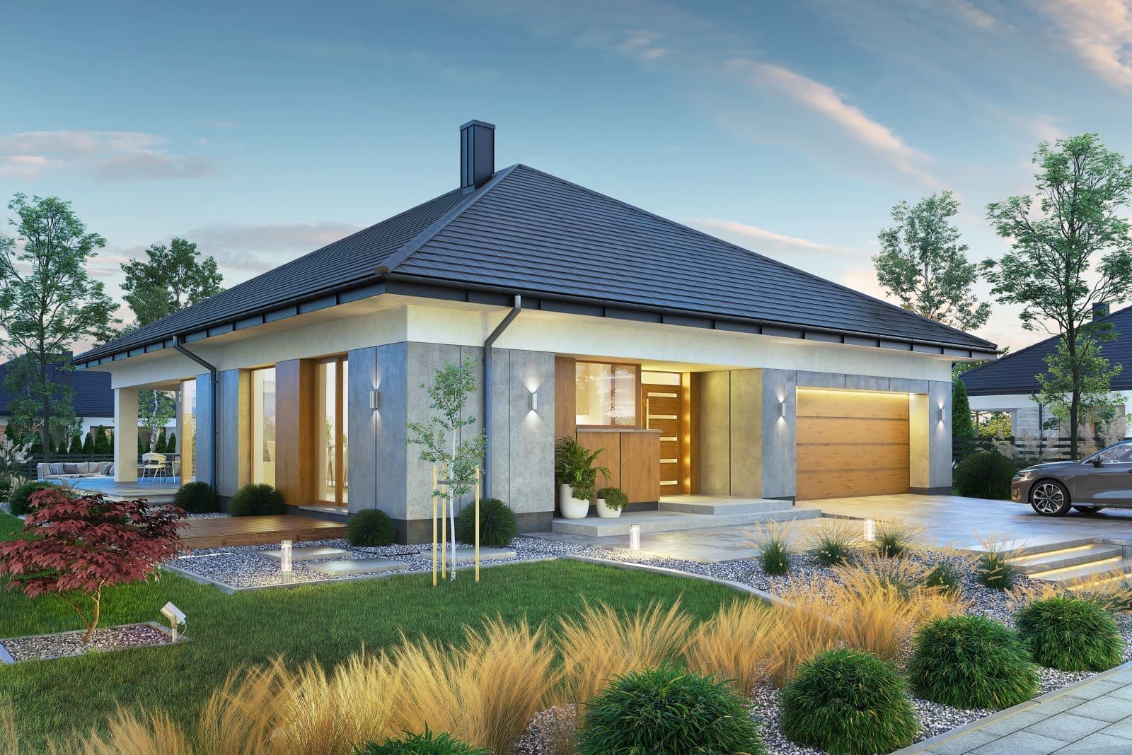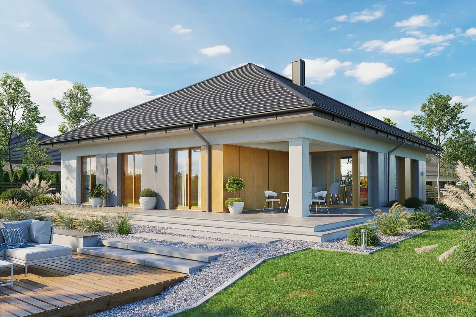 Wizualizacja jest propozycją tego jak dany projekt domu oraz jego otoczenie można zaaranżować. Sposób prowadzenia tarasu, kształt murków i elementy małej architektury typu pergole, donice itp. nie są objęte zakresem projektu. W związku z powyższym na projekcie budowlanym elementy te mogą nie być uwzględnione w projekcie ( patrz pergole ) lub zmieniony może być ich kształt i sposób prowadzenia ( wielkości tarasów, profil murków )