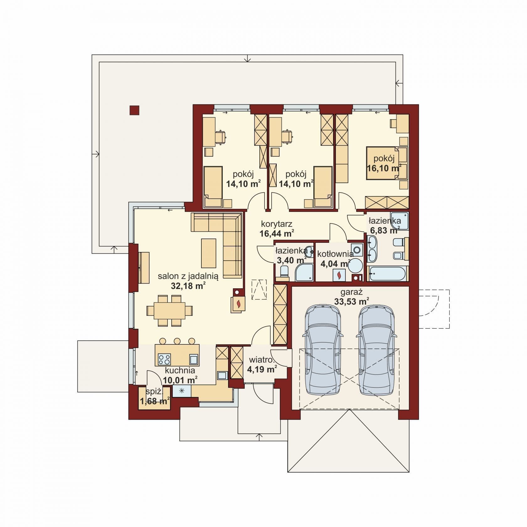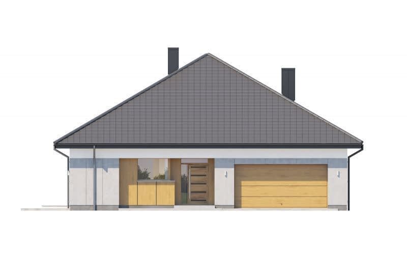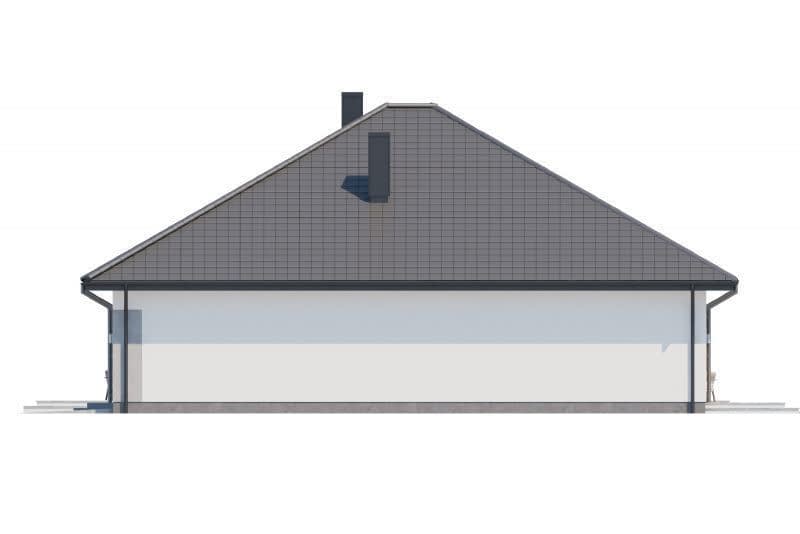 Z przedsionka z miejscem na szafę przechodzimy do części gospodarczej ( garaż i pomieszczenie gospodarcze z funkcją pralni) oraz strefy dziennej, składającej się z przestronnego salonu połączonego z jadalnią oraz kuchnią ze spiżarnią. Z funkcjonalnego hallu mamy dostęp do strefy prywatnej - trzech sypialni oraz dwóch łazienek.