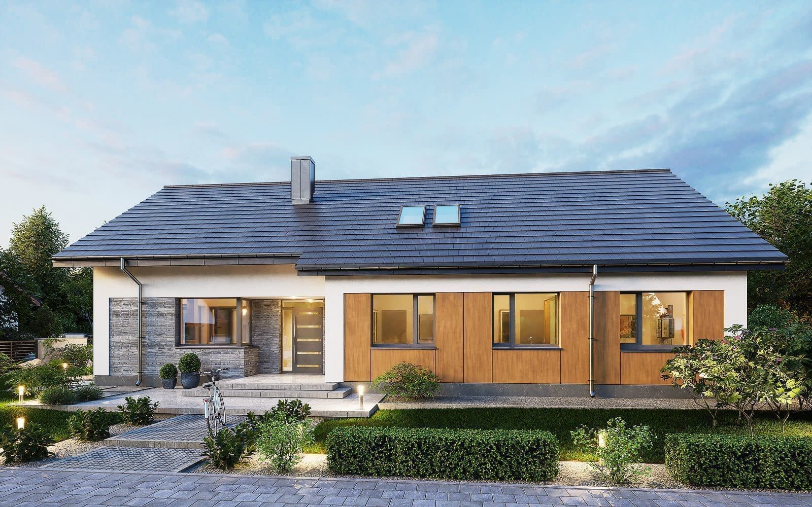 Wizualizacja jest propozycją tego jak dany projekt domu oraz jego otoczenie można zaaranżować. Sposób prowadzenia tarasu, kształt murków i elementy małej architektury typu pergole, donice itp. nie są objęte zakresem projektu. W związku z powyższym na projekcie budowlanym elementy te mogą nie być uwzględnione w projekcie ( patrz pergole ) lub zmieniony może być ich kształt i sposób prowadzenia ( wielkości tarasów, profil murków )