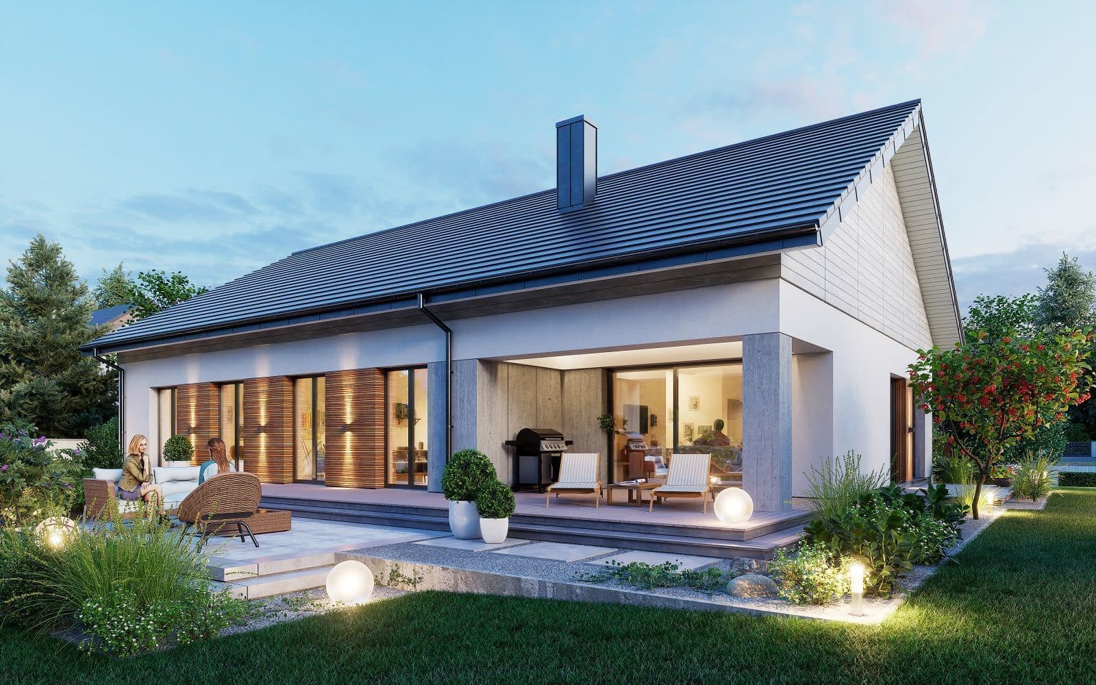 Wizualizacja jest propozycją tego jak dany projekt domu oraz jego otoczenie można zaaranżować. Sposób prowadzenia tarasu, kształt murków i elementy małej architektury typu pergole, donice itp. nie są objęte zakresem projektu. W związku z powyższym na projekcie budowlanym elementy te mogą nie być uwzględnione w projekcie ( patrz pergole ) lub zmieniony może być ich kształt i sposób prowadzenia ( wielkości tarasów, profil murków )