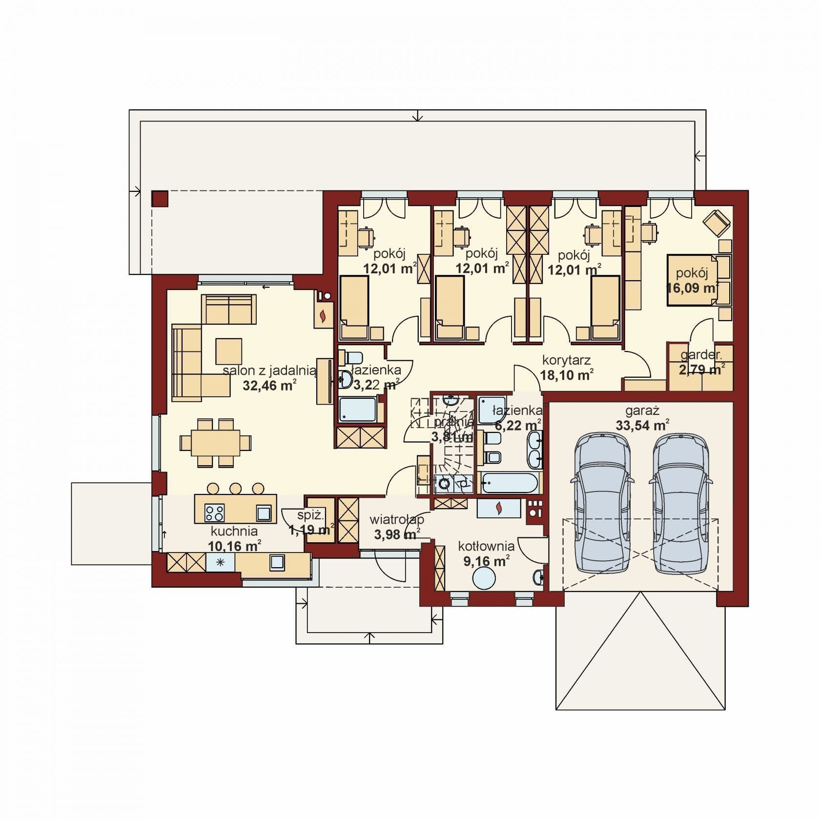 DOMENA 145 B, przedsionek z miejscem na szafę otwiera się na strefę dzienną, składającą się z przestronnego salonu połączonego z jadalnią oraz kuchni ze spiżarnią. Z korytarza mamy dostęp do strefy prywatnej - czterech sypialni ( jednej z garderobą) i dwóch łazienek . Plan domu uzupełnia pom. gosp i kotłownia.