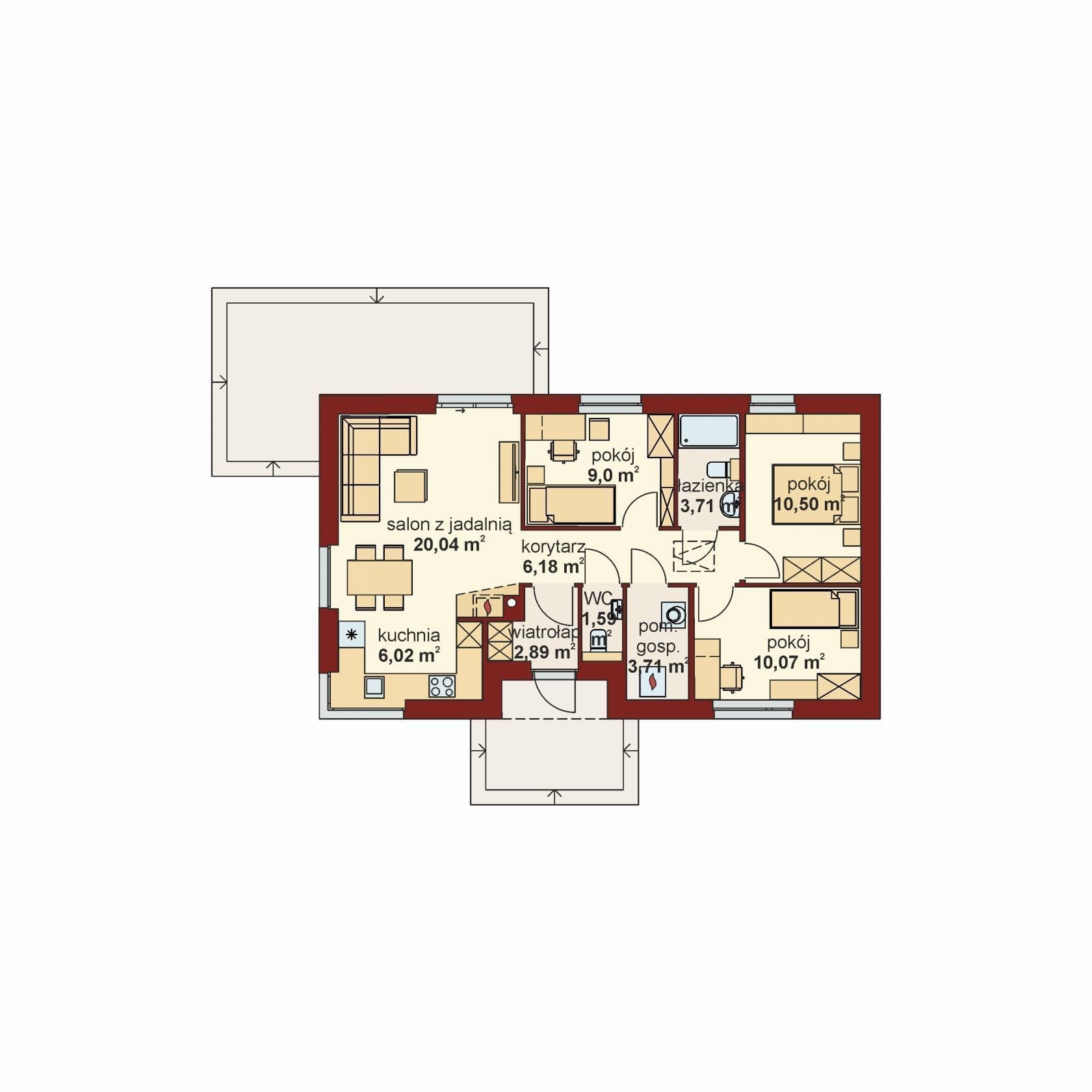 DOMENA 153 C1, przedsionek z miejscem na szafę otwiera się na strefę dzienną, składającą się z przestronnego salonu połączonego z jadalnią oraz kuchni.. Z korytarza mamy dostęp do strefy prywatnej - trzech sypialni ,łazienki oraz WC . Plan domu uzupełnia pomieszczenie gospodarcze.