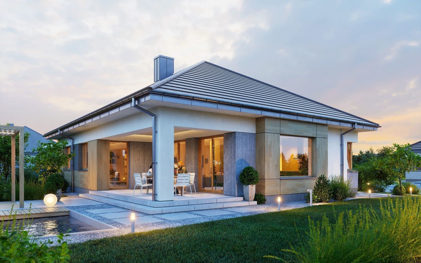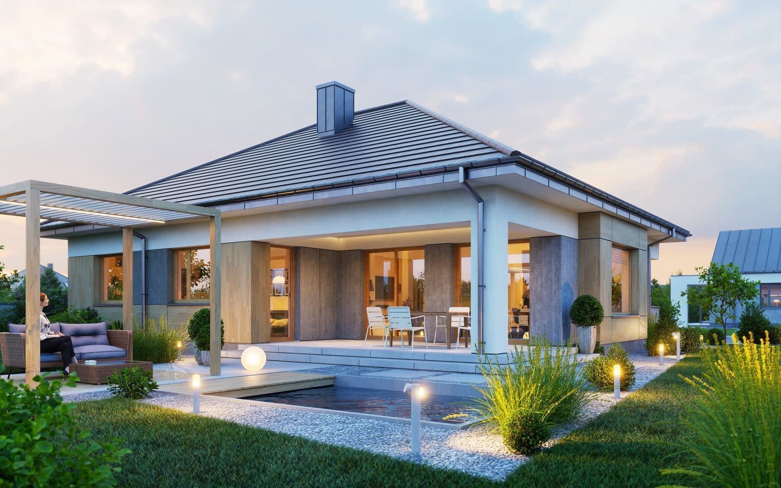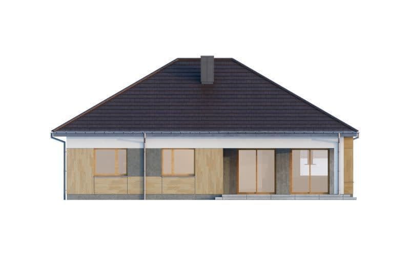 Wizualizacja jest propozycją tego jak dany projekt domu oraz jego otoczenie można zaaranżować. Sposób prowadzenia tarasu, kształt murków i elementy małej architektury typu pergole, donice itp. nie są objęte zakresem projektu. W związku z powyższym na projekcie budowlanym elementy te mogą nie być uwzględnione w projekcie lub zmieniony może być ich kształt i sposób prowadzenia ( wielkości tarasów, profil murków ).