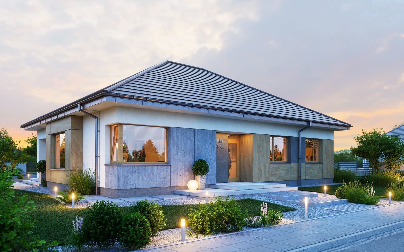 - Zmiana kształtu, wielkości i usytuowania elementów takich jak tarasy, murki i donice przedstawione w projekcie oraz zmiany szerokości biegów schodowych, liczby stopni i wymiarów schodów zewnętrznych.