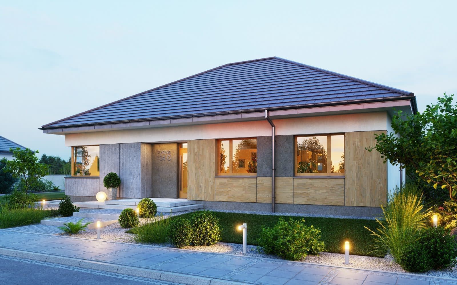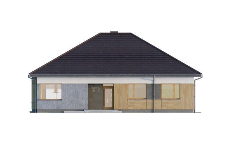 DOMENA 154 C, wiatrołap z miejscem na szafę otwiera się na strefę dzienną, składającą się z przestronnego salonu połączonego z jadalnią oraz kuchni ze spiżarnią. Z korytarza mamy dostęp do strefy prywatnej - trzech sypialni, gabinetu, pomieszczenia gospodarczego i dwóch łazienek.