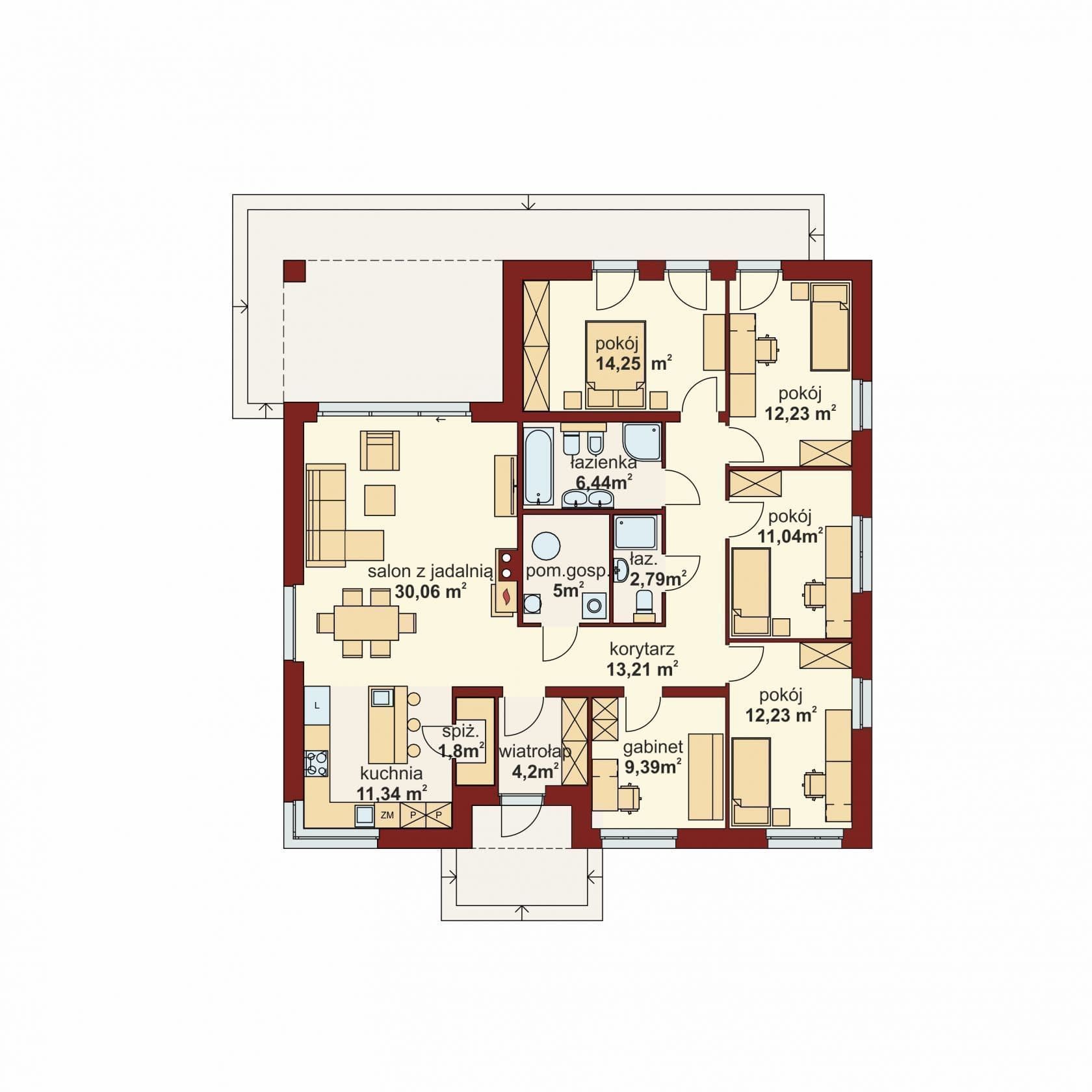 DOMENA 160 C, wiatrołap z miejscem na szafę otwiera się na strefę dzienną, składającą się z przestronnego salonu połączonego z jadalnią oraz kuchni ze spiżarnią. Z korytarza mamy dostęp do strefy prywatnej - czterech sypialni, ganinetu, kotłowni i dwóch łazienek.