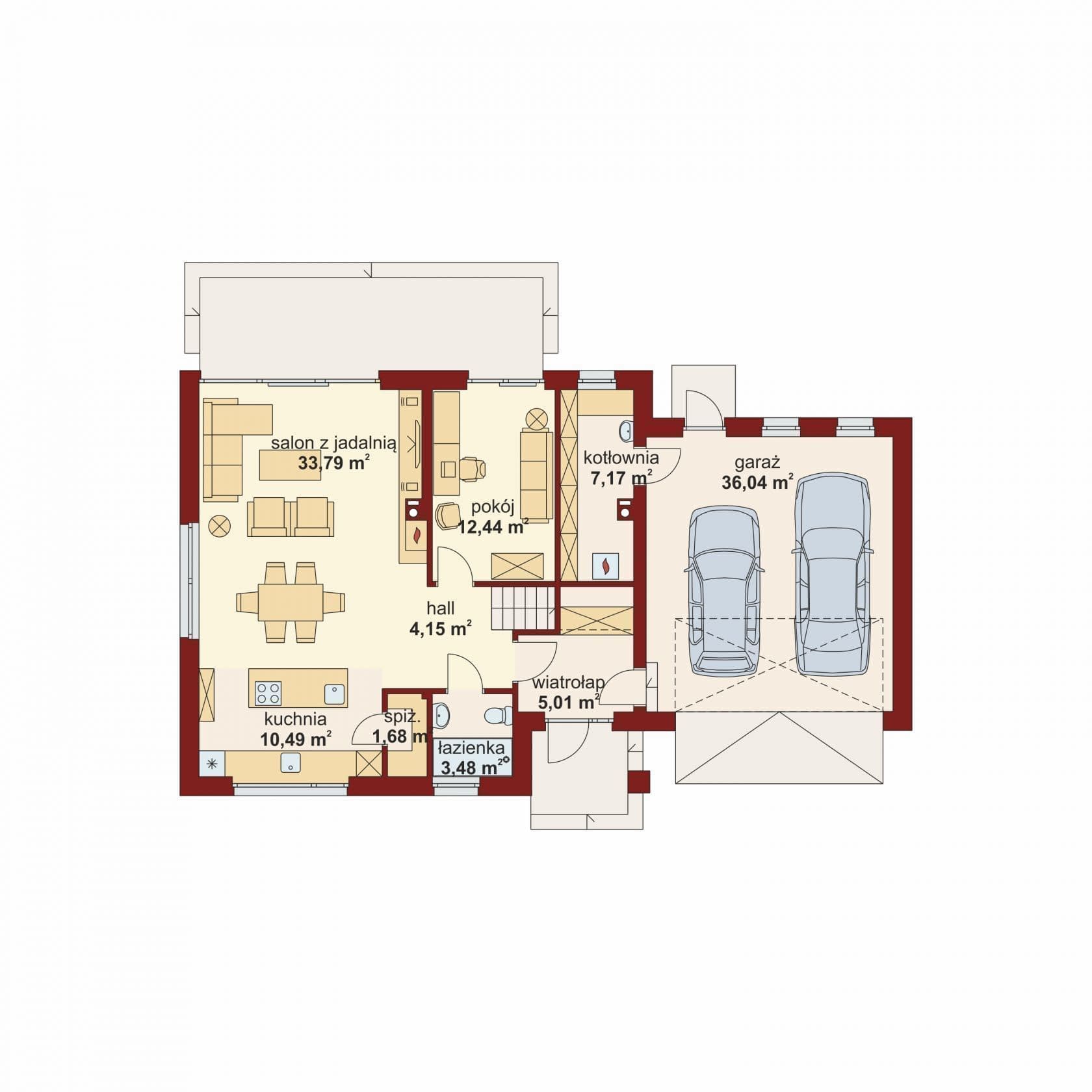 Przedsionek z miejscem na szafę otwiera się na strefę dzienną, składającą się z przestronnego salonu połączonego z jadalnią oraz kuchnią ze spiżarnią (którą można z łatwością oddzielić). Z funkcjonalnego holu mamy dostęp na poddasze, do łazienki, dodatkowego pokoju oraz części gospodarczej, składającej się z dwustanowiskowego garażu, poprzez który dostępne jest obszerne pomieszczenie gospodarcze (kotłownia) oraz wyjście do ogrodu.