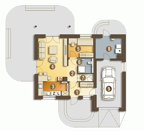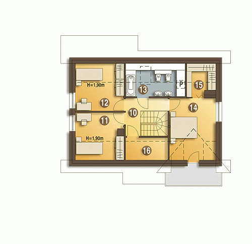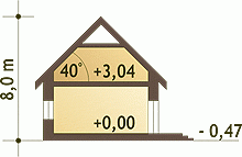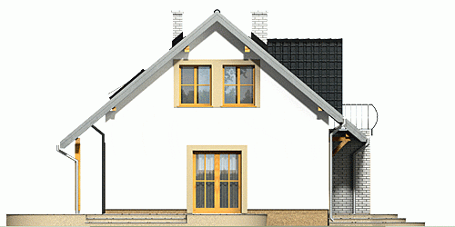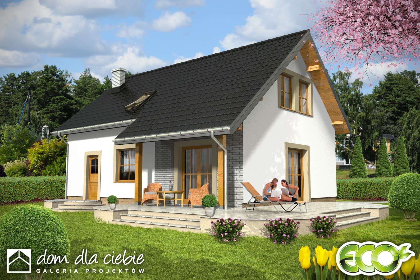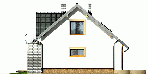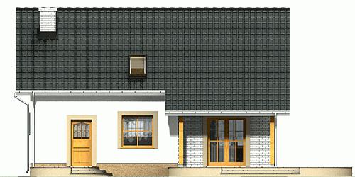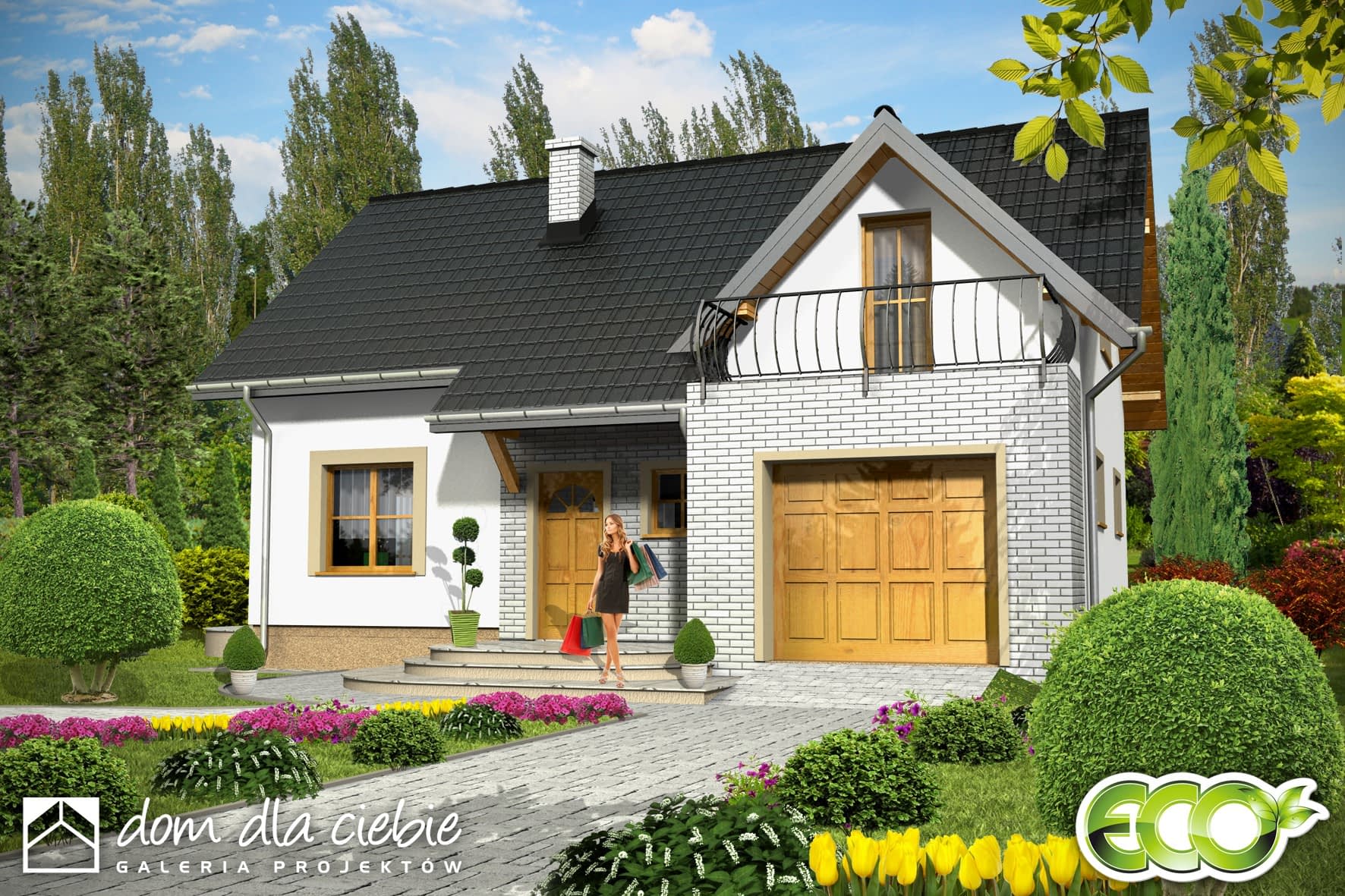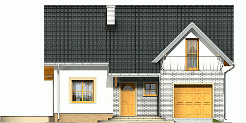 Niewielki ale funkcjonalny oraz ekonomiczny dom jednorodzinny z poddaszem użytkowym dla 3-4 osobowej rodziny. Budynek posiada prostą konstrukcję i zwartą bryłę a równocześnie klasyczny i urokliwy wygląd. Parter stanowią (oprócz wiatrołapu i łazienki): pokój, który można przeznaczyć na gabinet lub dodatkową sypialnię, wygodna kuchnia ze spiżarnią, oraz atrakcyjny salon, z którego wychodzi się na duży taras. Garaż włączony do bryły, dostępny jest z wiatrołapu a pom. gospodarcze z piecem C.O. znajduje się za garażem. Poddasze składa się z trzech sypialni oraz obszernej łazienki. Sypialnia rodziców posiada taras i garderobę.