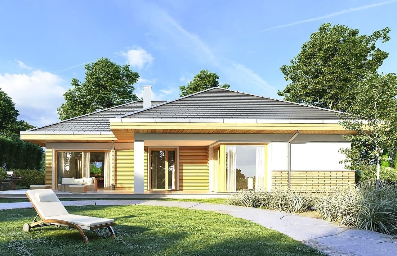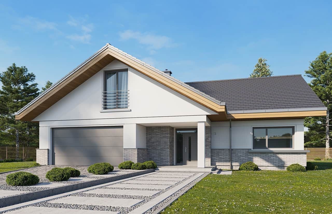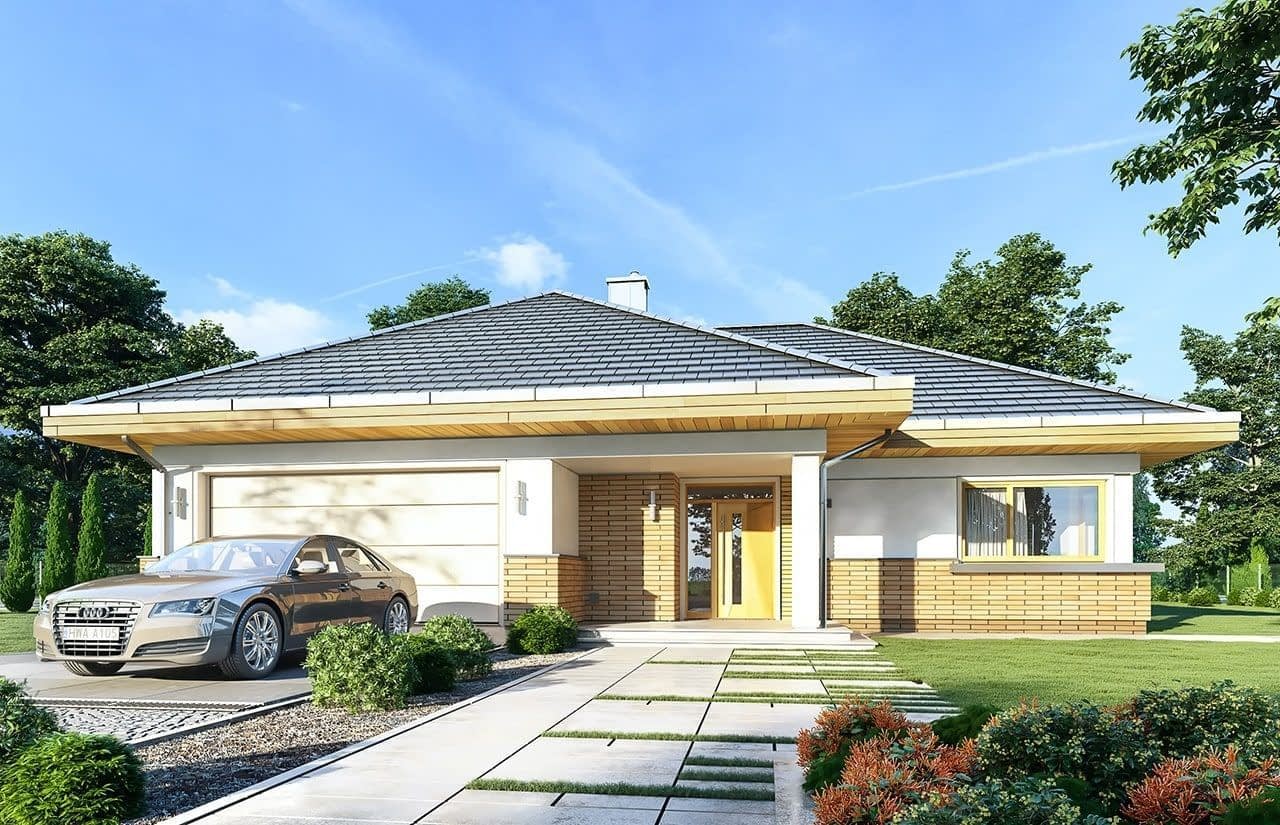 Projekt domu Doskonały 2 jest wersją wariantową projektu parterowego domku jednorodzinnego „Doskonały”. Projekt przeznaczony jest dla cztero-pięcioosobowej rodziny. Od podstawowego modelu różni się wyższym dachem, a co za tym idzie większym strychem, który może zostać adaptowany na poddasze. Domek zaprojektowano jako rozłożystą parterową bryłę zbudowaną na planie litery T, z garażem i podcieniem wejściowym od frontu, oraz podcieniem ogrodowym przykrywającym taras od strony elewacji tylnej. Duże przeszklenia okien, okładziny klinkierowe ścian, i fragmenty elewacji wykończone drewnem nadają bryle przekrytej wielospadowym dachem dodatkowej atrakcyjności. Szerokie okapy z drewnianą podbitką i trzema warstwami deski okapowej z krytą rynną wyróżniają dom oryginalnym detalem. Front domu ujmuje swoją dostojnością i reprezentacyjnym lookiem. Wejściowe drzwi z naświetlami zapraszają do wnętrza. Z kolei elewacja ogrodowa uwodzi szerokimi narożnymi przeszkleniami otwierającymi wnętrze domu na ogród. Wnętrze zaprojektowano na jednym poziomie - wszystkie potrzebne pomieszczenia znajdują się na parterze. Strych możliwy do zaadaptowania na dodatkowe poddasze stanowi możliwą opcję - dodatek do i tak pięknego wnętrza na parterze. Z wygodnego przedsionka dostajemy się do holu i dalej do salonu. Możemy też przejść w bok do kotłowni i garażu, oraz dostać się do spiżarni, a przez nią do kuchni. Takie połączenie ułatwia codzienny transport zakupów domowych. Salon otwarty na taras i ogród szerokim narożnym przeszkleniem łączy w sobie strefę wypoczynkową z kominkiem i ścianą TV i jadalnię, połączoną z ładną kuchnią. W strefie prywatnej domowników mamy sypialnię rodziców z garderobą i niewielką łazienką z prysznicem, dodatkowy pokój - np. gabinet, dwie sypialnie dzieci z szafami w zabudowie, oraz dużą łazienkę i wc dostępne z holu. Z holu wchodzimy też schodami na strych, który można zaadaptować na dodatkowe poddasze. „Doskonały 2” ma stosunkowo prostą konstrukcję. Dom jest niedrogi w budowie i późniejszym utrzymaniu. Do świetna propozycja dla osób marzących o parterowym wygodnym domu. Zapraszamy do zapoznania się z pełną ofertą pracowni MG Projekt: Doskonały i Doskonały 2 B.