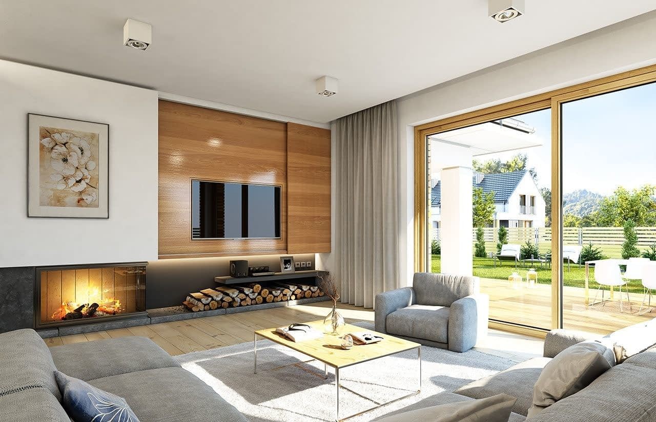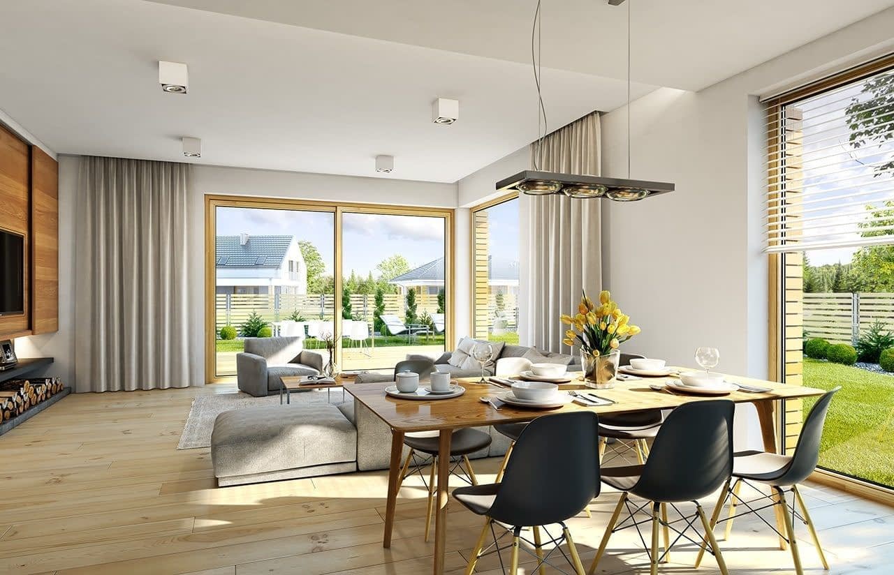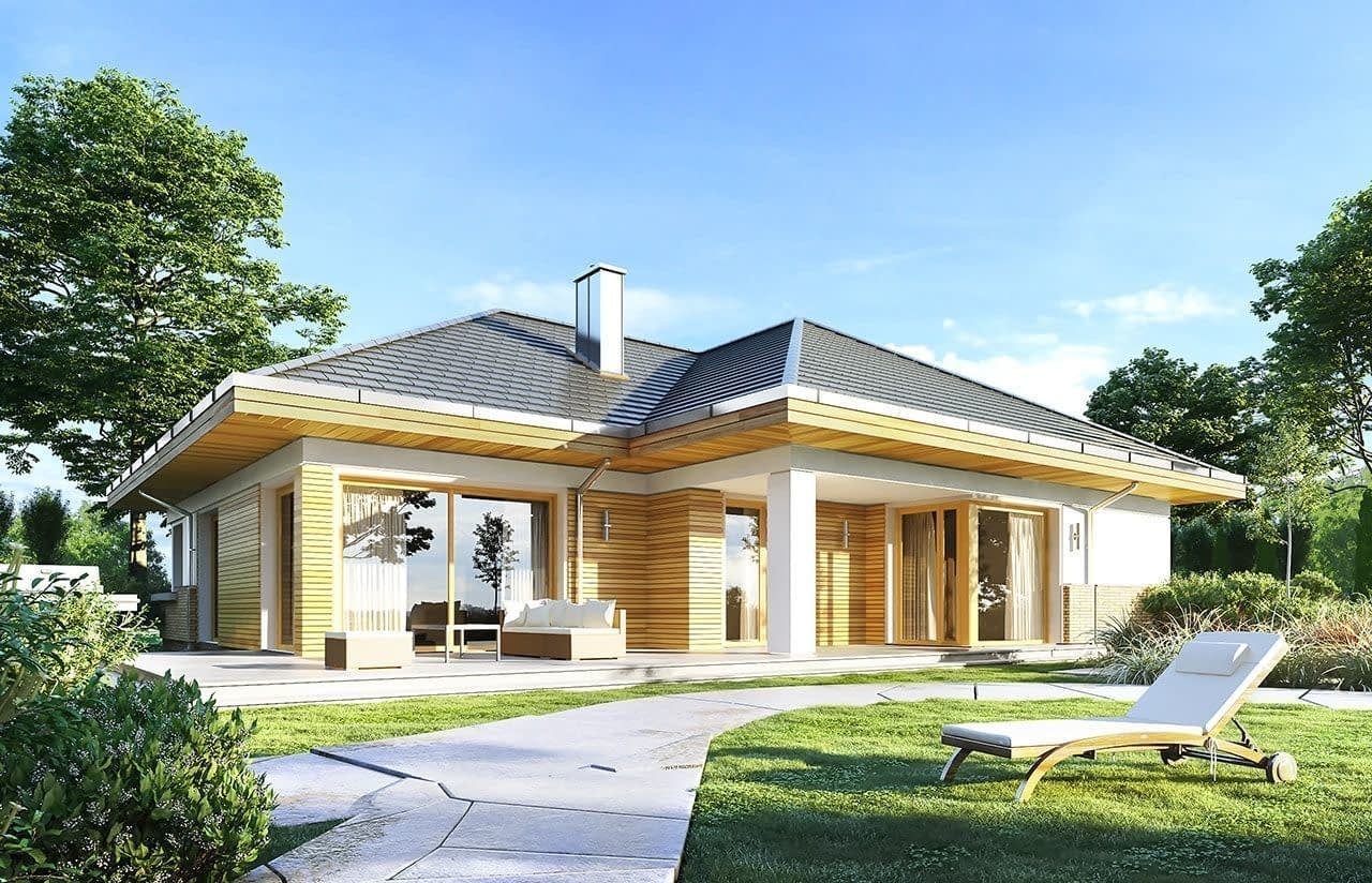 Projekt domu Doskonały 2 jest wersją wariantową projektu parterowego domku jednorodzinnego „Doskonały”. Projekt przeznaczony jest dla cztero-pięcioosobowej rodziny. Od podstawowego modelu różni się wyższym dachem, a co za tym idzie większym strychem, który może zostać adaptowany na poddasze. Domek zaprojektowano jako rozłożystą parterową bryłę zbudowaną na planie litery T, z garażem i podcieniem wejściowym od frontu, oraz podcieniem ogrodowym przykrywającym taras od strony elewacji tylnej. Duże przeszklenia okien, okładziny klinkierowe ścian, i fragmenty elewacji wykończone drewnem nadają bryle przekrytej wielospadowym dachem dodatkowej atrakcyjności. Szerokie okapy z drewnianą podbitką i trzema warstwami deski okapowej z krytą rynną wyróżniają dom oryginalnym detalem. Front domu ujmuje swoją dostojnością i reprezentacyjnym lookiem. Wejściowe drzwi z naświetlami zapraszają do wnętrza. Z kolei elewacja ogrodowa uwodzi szerokimi narożnymi przeszkleniami otwierającymi wnętrze domu na ogród. Wnętrze zaprojektowano na jednym poziomie - wszystkie potrzebne pomieszczenia znajdują się na parterze. Strych możliwy do zaadaptowania na dodatkowe poddasze stanowi możliwą opcję - dodatek do i tak pięknego wnętrza na parterze. Z wygodnego przedsionka dostajemy się do holu i dalej do salonu. Możemy też przejść w bok do kotłowni i garażu, oraz dostać się do spiżarni, a przez nią do kuchni. Takie połączenie ułatwia codzienny transport zakupów domowych. Salon otwarty na taras i ogród szerokim narożnym przeszkleniem łączy w sobie strefę wypoczynkową z kominkiem i ścianą TV i jadalnię, połączoną z ładną kuchnią. W strefie prywatnej domowników mamy sypialnię rodziców z garderobą i niewielką łazienką z prysznicem, dodatkowy pokój - np. gabinet, dwie sypialnie dzieci z szafami w zabudowie, oraz dużą łazienkę i wc dostępne z holu. Z holu wchodzimy też schodami na strych, który można zaadaptować na dodatkowe poddasze. „Doskonały 2” ma stosunkowo prostą konstrukcję. Dom jest niedrogi w budowie i późniejszym utrzymaniu. Do świetna propozycja dla osób marzących o parterowym wygodnym domu. Zapraszamy do zapoznania się z pełną ofertą pracowni MG Projekt: Doskonały i Doskonały 2 B.