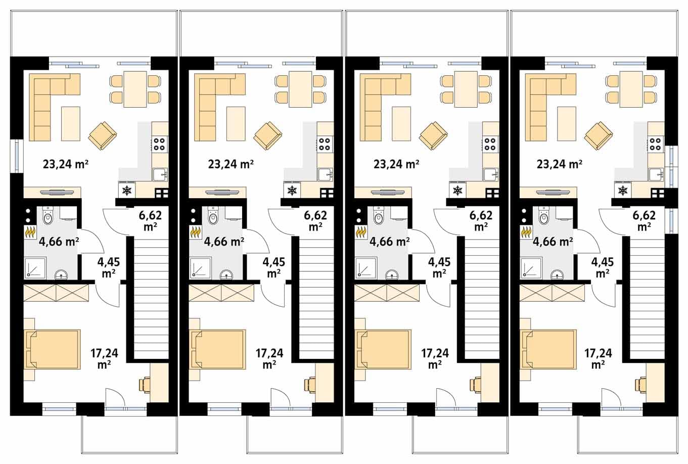 Budynek w zabudowie szeregowej o dużej intensywności. Dracena to ekonomiczny, dwulokalowy budynek mieszkalny. Może funkcjonować jako budynek mieszczący dwa oddzielne mieszkania lub jako dom dwupokoleniowy. Nowoczesna, zwarta bryła zapewnia oszczędność na budowie oraz w codziennej eksploatacji budynku. Układ konstrukcyjny tarasów jest niezależny od konstrukcji budynku, dzięki czemu wyeliminowano mostki termiczne. Dzięki swojej odrębności, tarasy mogą zostać wybudowane na innym etapie inwestycji. Niewielkie gabaryty umożliwiają lokalizację segmentu na wąskich działkach.Konstrukcja